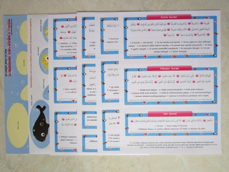Duha Suresi, Zilzal Suresi, Karia Suresi, Tin Suresi, Asr Suresi, Humeze Suresi, Adiyat Suresi, Tekasür Suresi, Kadir Suresi, İnşirah Suresi, Ayetel Kürsi, Kunut Duaları 1, Kunut Duaları 2