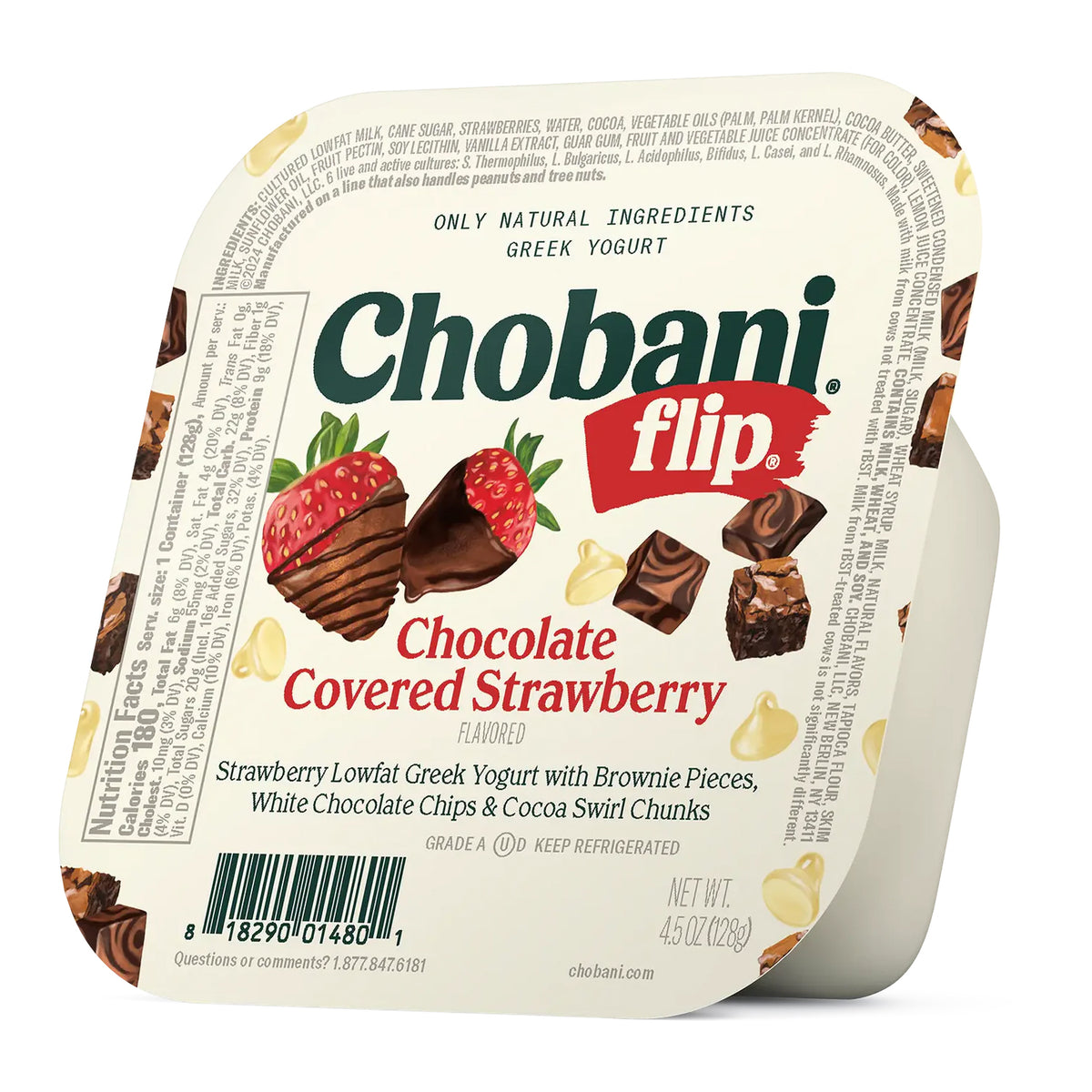 Strawberry Lowfat Greek Yogurt with brownie pieces, white chocolate chips, and cocoa swirl chunks. Made with only natural ingredients.