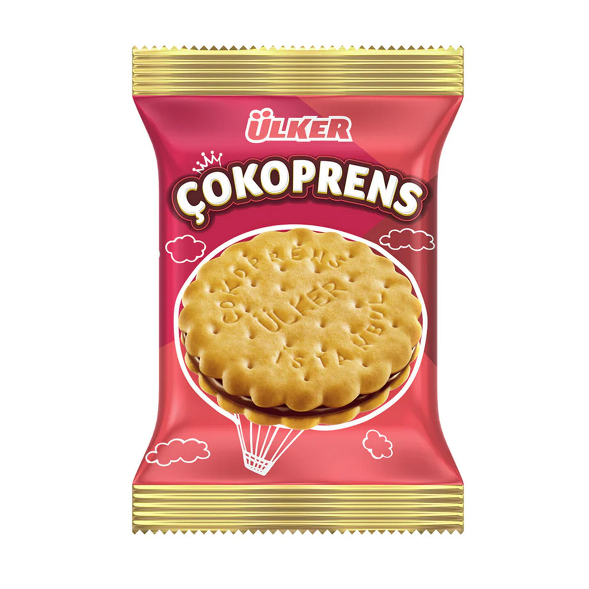 Ülker Çokoprens (30g) is a beloved Turkish sandwich biscuit featuring two crispy layers filled with rich cocoa cream.