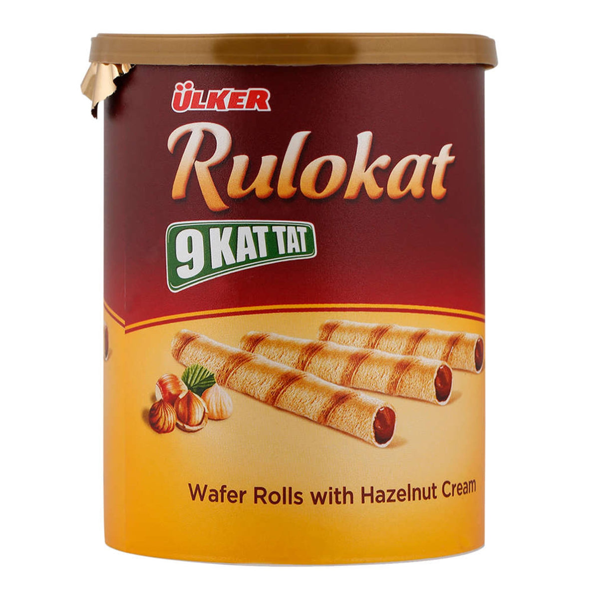 Ülker Rulokat is a beloved Turkish snack featuring crispy wafer rolls filled with rich hazelnut cream. The 170g pack is ideal for sharing or enjoying as a personal treat. The product is packaged in a 170g tin, designed to maintain freshness and protect the delicate wafer rolls.