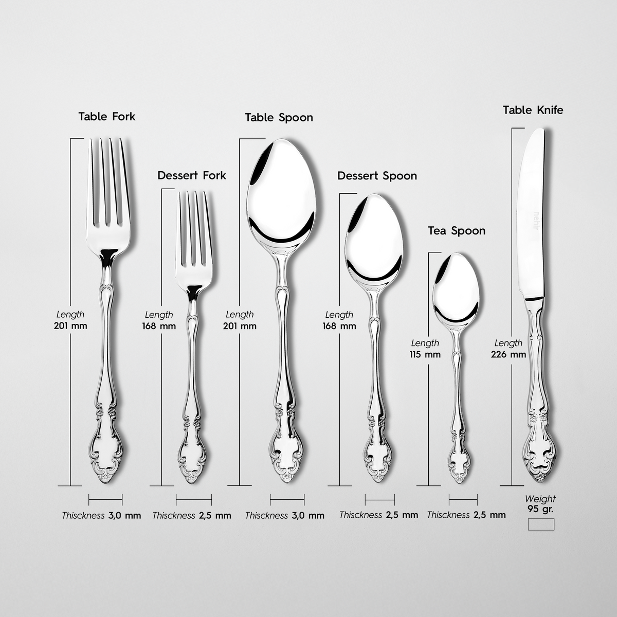 Made in Turkey: The ADRIANA Mirror Finish Cutlery Set is meticulously crafted by expert artisans at Nehir in Turkey. High craftsmanship and quality are incorporated into every piece, adding an elegant touch to your dining table.