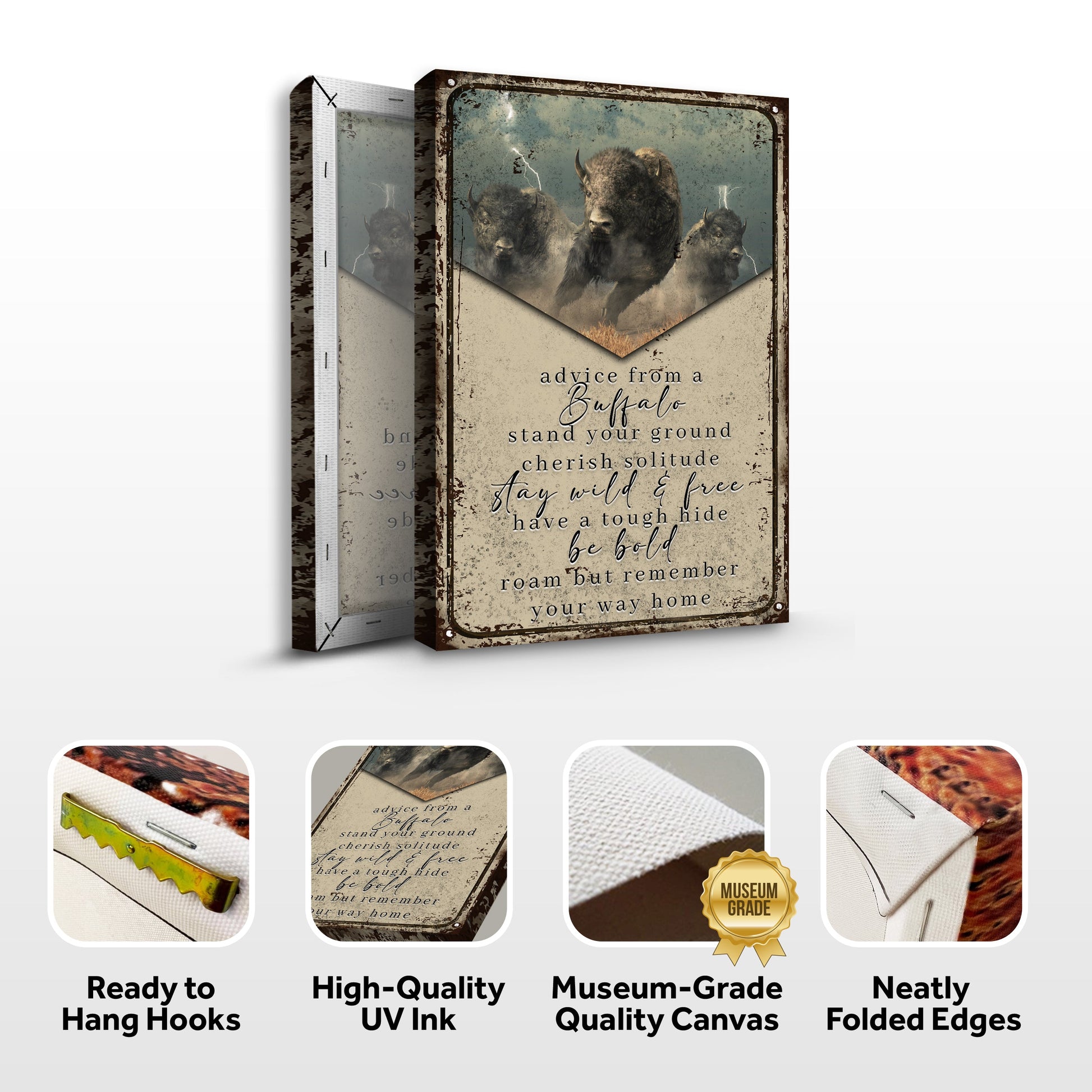 Featuring a stunning depiction of a buffalo in its natural habitat, this canvas sign exudes strength, resilience, and a deep connection to nature. The carefully chosen words of advice, elegantly presented in bold typography, invite you to embrace these valuable life lessons.