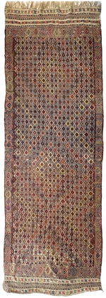Experience the timeless beauty and expert craftsmanship of our Antique Turkish Jajim Wool Rug. Hand-knotted from 100% wool and featuring a unique Jajim design, this Anatolian rug from the 1930s is not only a stunning piece of art, but also a valuable addition to any home. Each rug is one-of-a-kind, adding character and charm to any space. Made in Turkey, this 5’6” x 14’5” rug showcases the rich history and skilled artistry of Turkish rug-making.