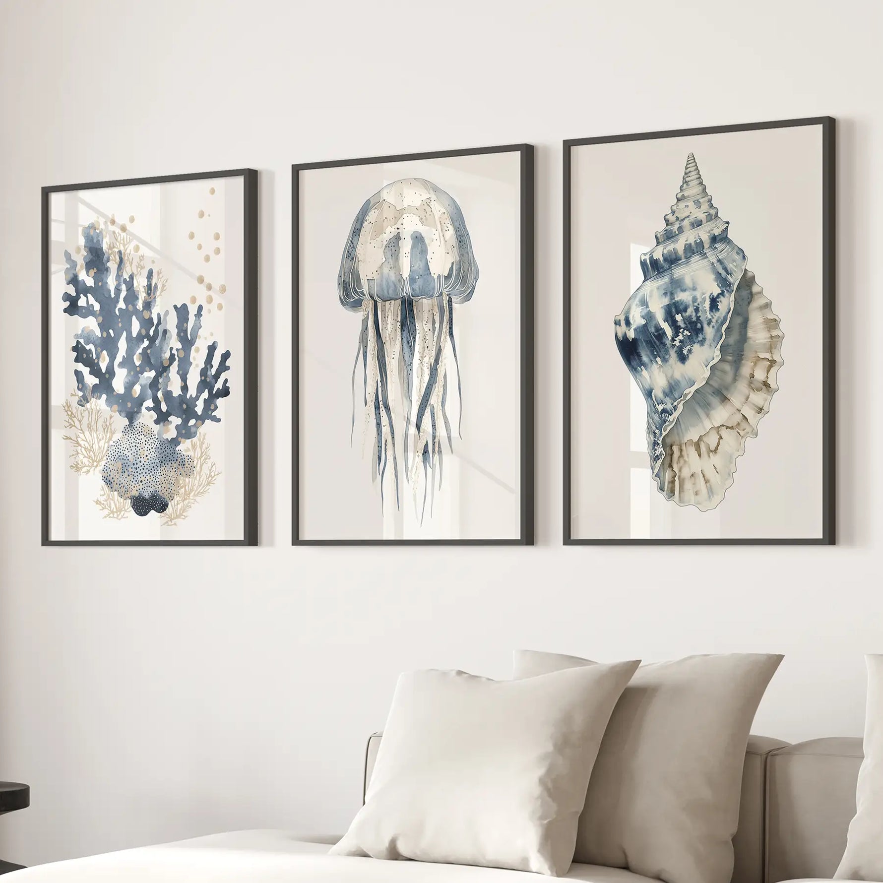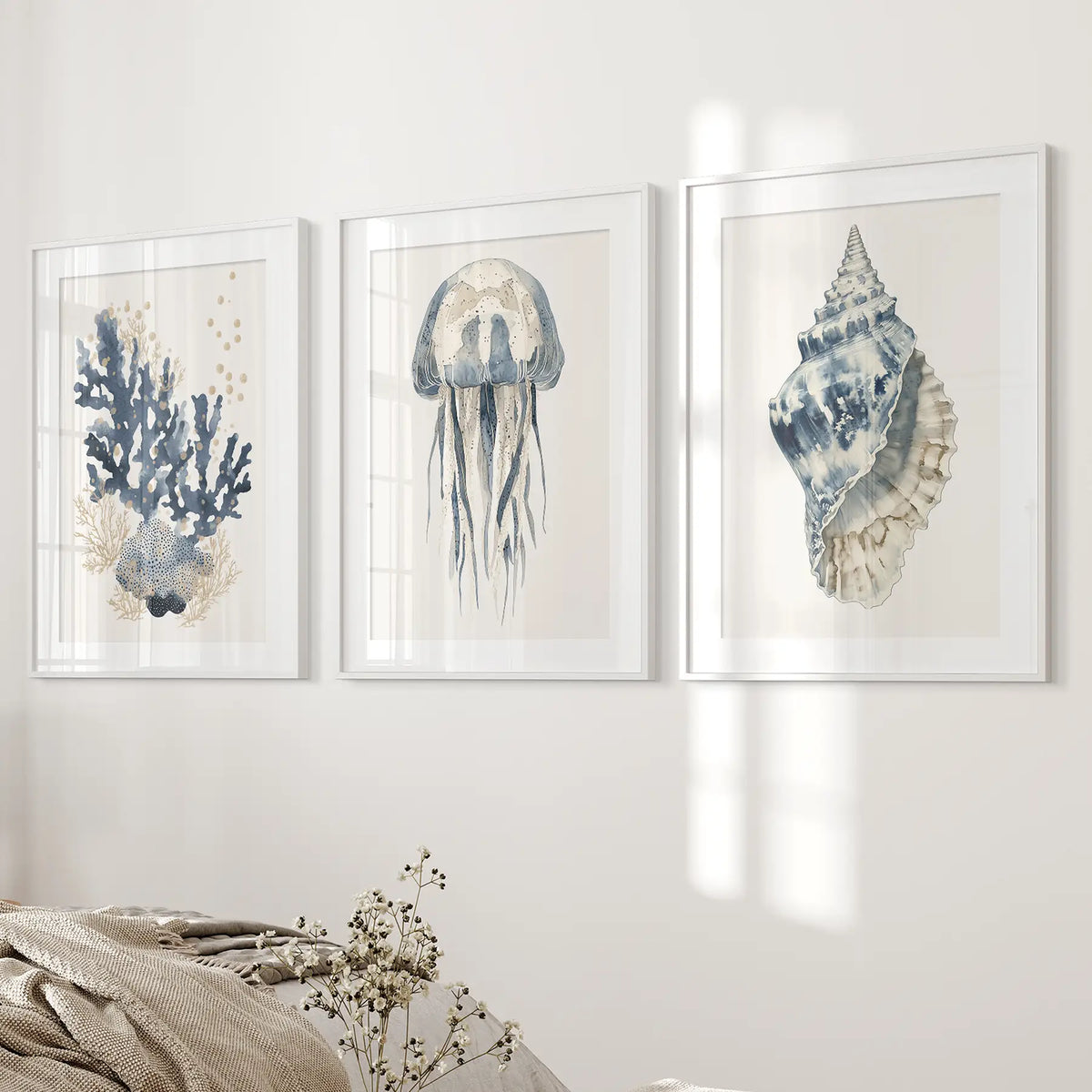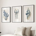 Beach House Wall Art Set. Blue Coral, Jellyfish, Shell