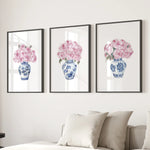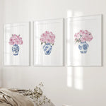 Elegant wall art set of 3 featuring watercolor pink roses in classic blue and white porcelain vases. This floral triptych blends timeless botanical charm with modern minimalism, making it a perfect decor choice for living rooms, bedrooms, or farmhouse-style interiors.