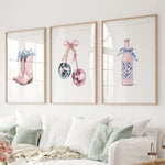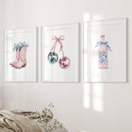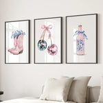 Chic wall art set of 3 featuring trendy pink cowboy boots with flowers, playful disco cherry balls tied with a ribbon, and a pink bottle adorned with a blue floral label and bow. This stylish and modern trio brings a touch of fun, fashion, and Western glam to your home decor.