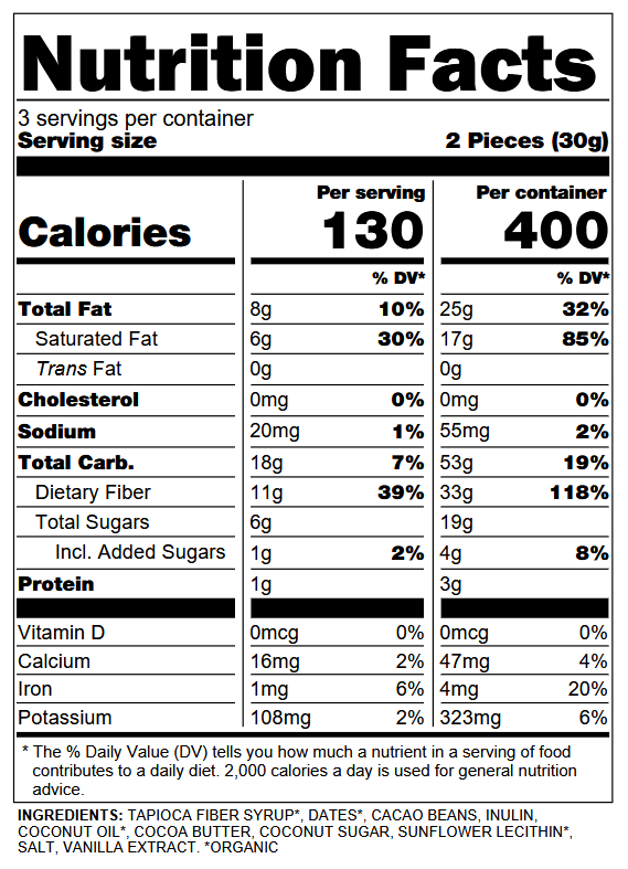 Ingredients: Tapioca fiber syrup, dates, cacao beans, inulin, coconut oil, cocoa butter, coconut sugar, sunflower lecithin, salt, vanilla extract