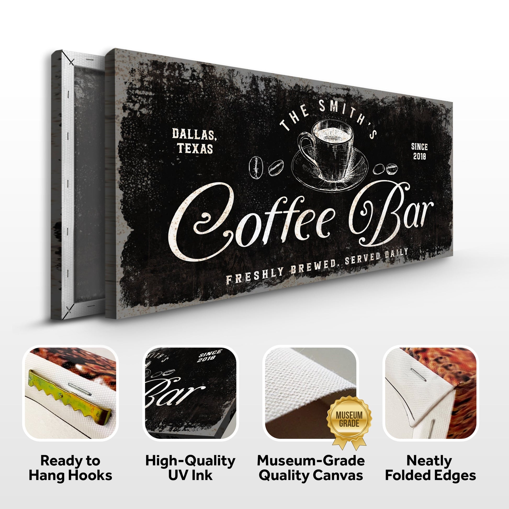 Add a vintage twist to your coffee bar with the grounded warmth of our coffee bar canvas sign. Whether you place it on the walls of your coffee business location or your kitchen at home, this coffee bar canvas print will add a touch of rustic elegance to your atmosphere. You can customize it with your name, business logo, family photo, or a poem to remind you of your love for coffee. Either way, a coffee wall art piece will surely add some brown and grounding feelings to your surroundings. What are you waiting for? When you order this coffee bar print on canvas!