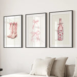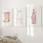 Charming set of 3 wall art prints featuring pink cowgirl boots with bows, delicate ribbon illustrations, and a floral wine bottle with a bow. Perfect for girly western or cottagecore interiors, adding a playful yet elegant touch to bedrooms, living rooms, or creative spaces.
