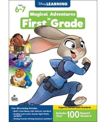 THE MAGIC OF DISNEY: The Disney Learning Magical Adventures in First Grade Workbook works with kids ages 6-7 to practice math and language arts skills and gets them ready for future education.