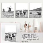 Farmhouse Black White Wall Art. Windmill, 3 Cows, Hay Bales