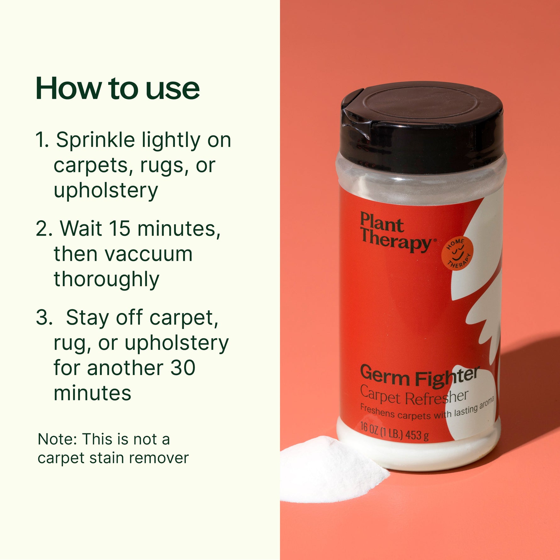 Safe to use around children and pets when used as directed, Germ Fighter Carpet Refresher is a natural, easy-to-use freshening solution for your home. Made in the USA.
