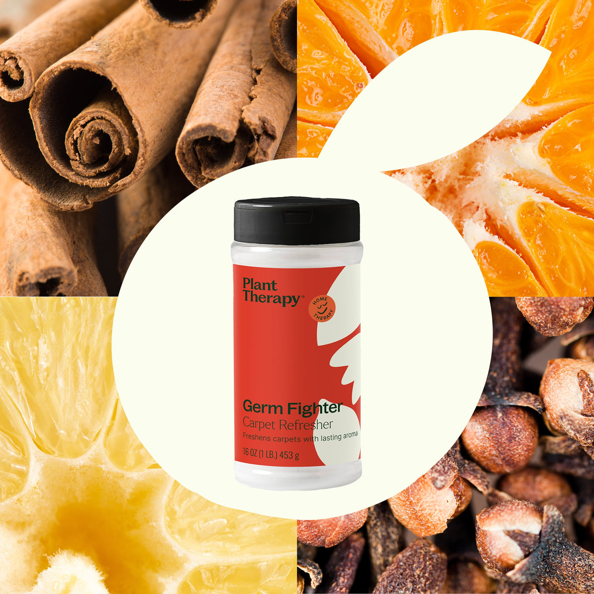 Keep your carpets smelling fresh and neutralize odors with our Germ Fighter Carpet Refresher. Our aluminum-free baking soda formula naturally absorbs odors on carpets and upholstery. Naturally scented with Lemon, Blood Orange, Rosemary, Frankincense, Eucalyptus, Cinnamon, and Clove essential oils, this Carpet Refresher leaves behind a fresh, warm, and spicy aroma.