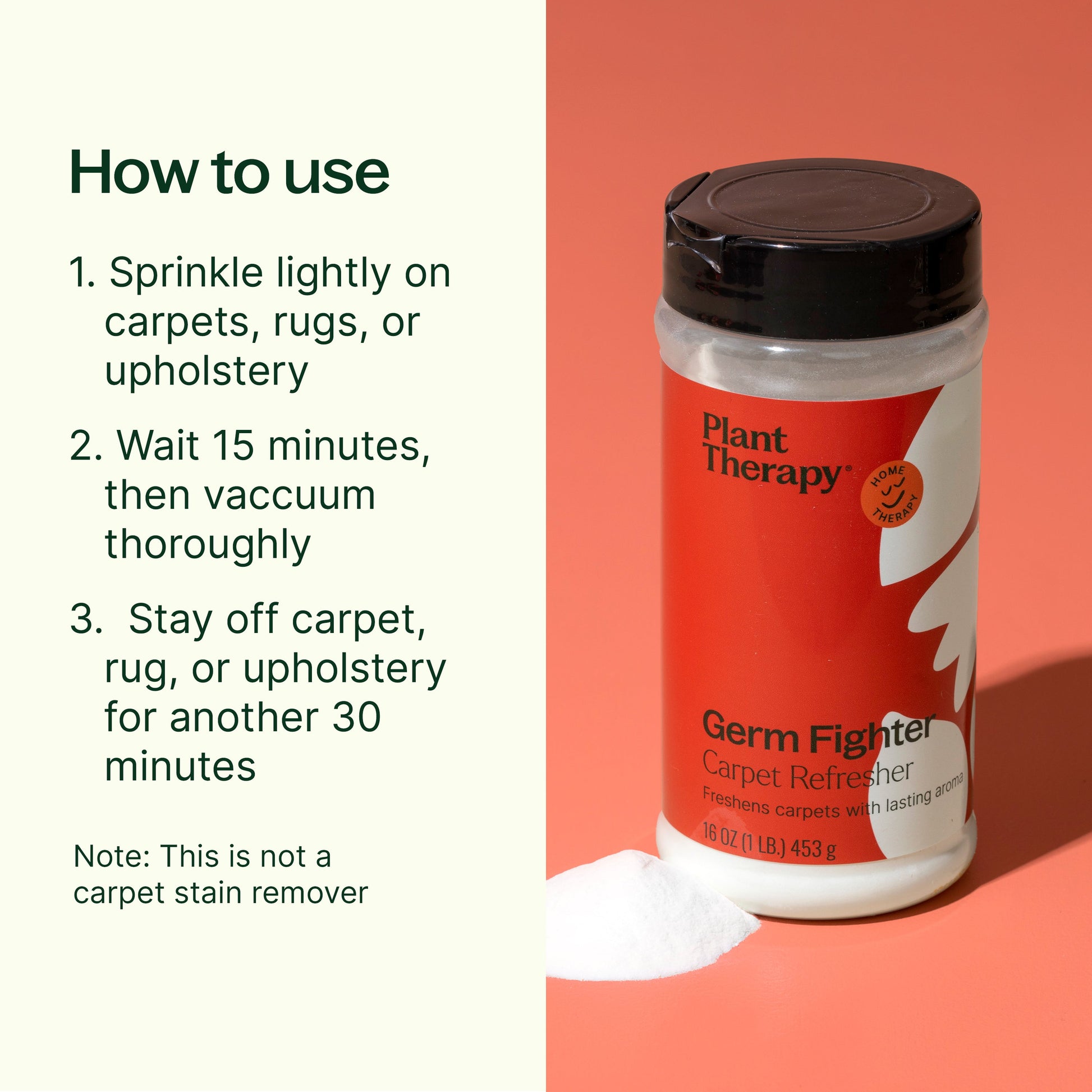 Keep your carpets smelling fresh and neutralize odors with our Germ Fighter Carpet Refresher. Our aluminum-free baking soda formula naturally absorbs odors on carpets and upholstery. Naturally scented with Lemon, Blood Orange, Rosemary, Frankincense, Eucalyptus, Cinnamon, and Clove essential oils, this Carpet Refresher leaves behind a fresh, warm, and spicy aroma.Safe to use around children and pets when used as directed, Germ Fighter Carpet Refresher is a natural, easy-to-use freshening solution for your home. Made in the USA.