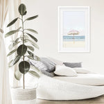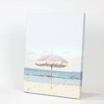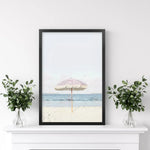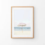 This summer coastal poster is made in pleasant pastel colors, so it will fit perfectly in a girl's nursery. It depicts a large pink umbrella against a background of blue ocean waves. The best solution for it would be a white frame with a mat!