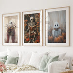 Enchanting Halloween wall art set of 3 featuring a ghost holding autumn flowers, a skeleton reading among pumpkins, and a ghost reading in a pumpkin patch. Perfect for cozy fall decor, spooky cottagecore vibes, or a unique seasonal gallery wall.