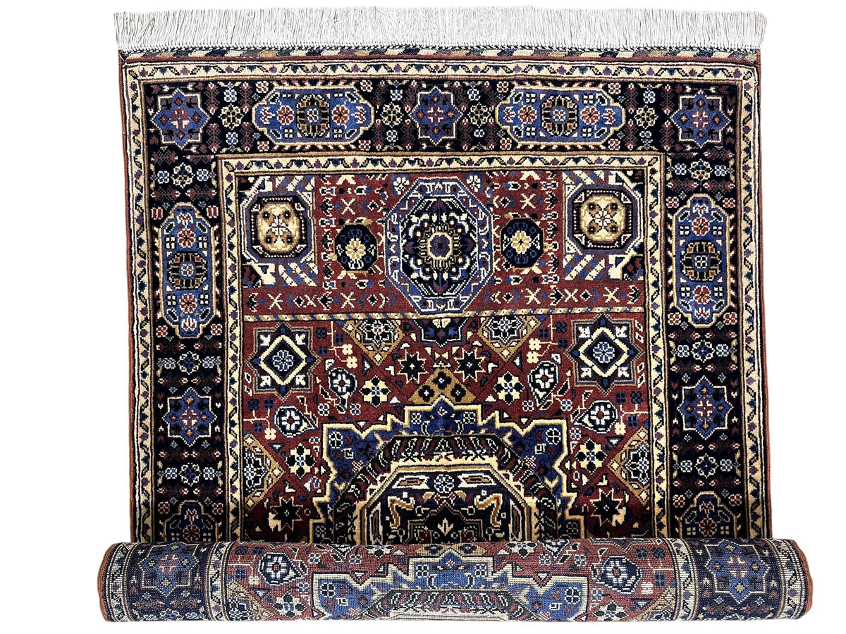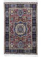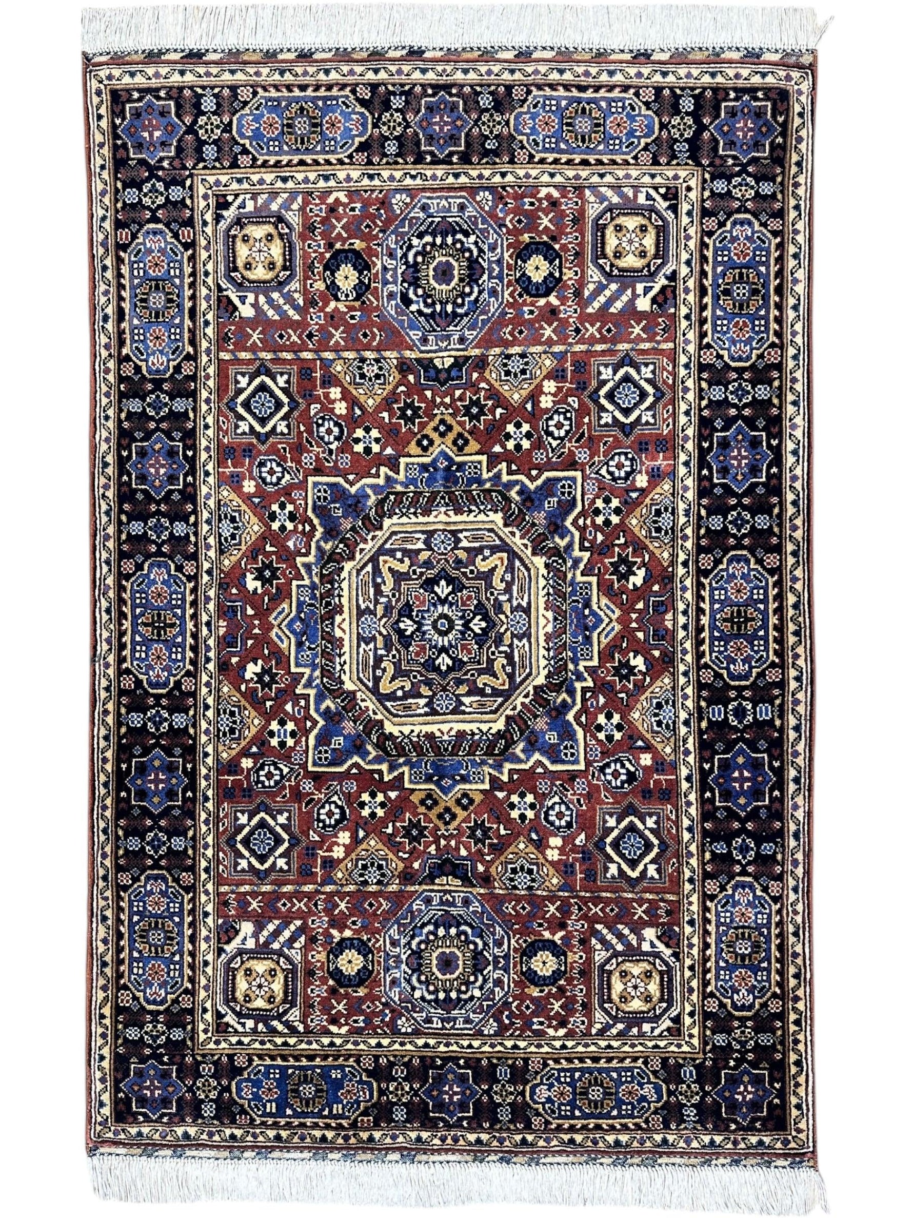 Elevate your space with this stunning hand-knotted wool Mamluk rug, featuring a balanced palette of deep navy blue and warm terracotta brown tones. Its intricate geometric medallion design and traditional motifs are inspired by classic Mamluk artistry, exuding timeless elegance. Measuring 40” x 62” with a 0.5” thickness, this rug offers both durability and softness, perfect for enhancing any living room, office, or hallway. Crafted with care by skilled artisans, this piece (ID: MMBR-35) embodies the rich heritage of Afghan rug-making.