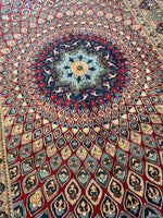 Rooted in centuries of Afghani weaving mastery, this hand-knotted Parak rug—named after the word for "dome"—carries the spirit of ancient architectural forms into textile art. Expertly woven in Afghanistan, its design centers on a mesmerizing geometric medallion that radiates across a rich red field, framed by ornate borders in blue, cream, and green. The interplay of shapes and colors reflects a cultural legacy where art, geometry, and symbolism intertwine.