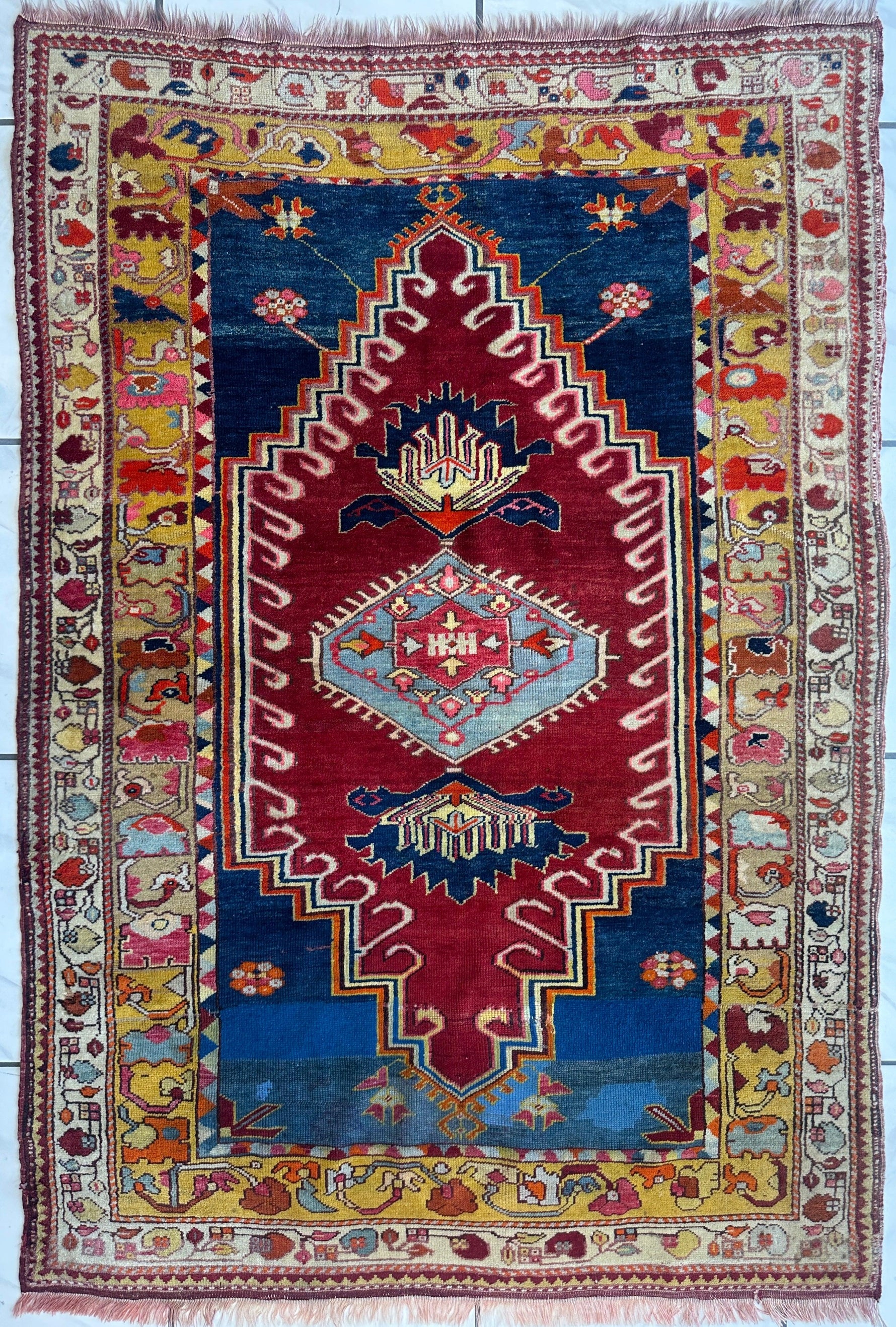 Hand-Knotted Antique Turkish Melas Wool Rug – 4'3" x 5'11" – Vibrant Geometric Motifs