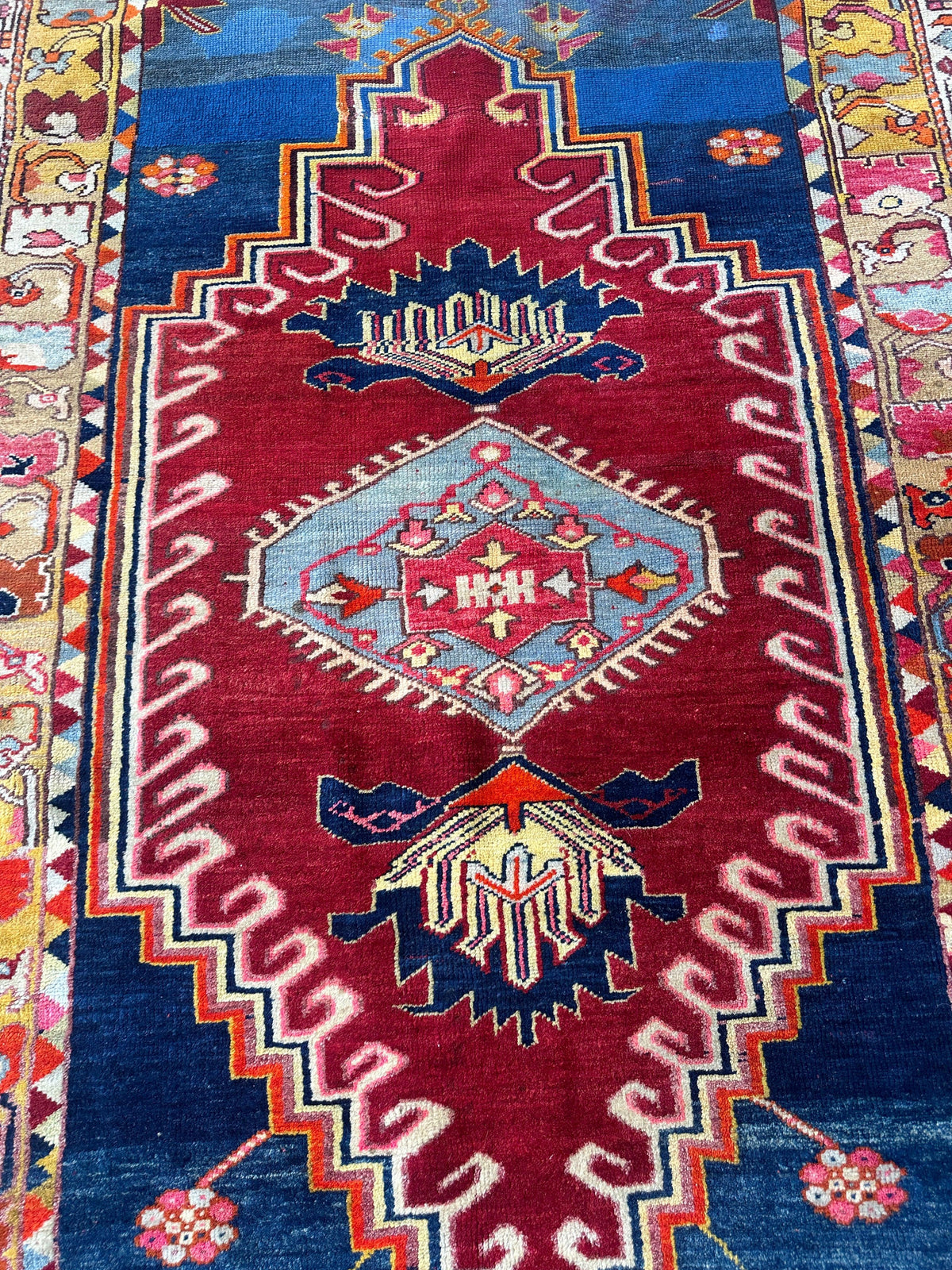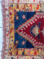 This exquisite antique Turkish Melas rug, woven before 1900, is a stunning piece of artistry and history. Known for their vibrant color palette and intricate geometric motifs, Melas rugs are celebrated for their unique character. This rug features a bold central medallion surrounded by a lively combination of floral and zigzag patterns in red, blue, gold, and cream hues. The outer border is adorned with symbolic designs that add depth and narrative to its overall composition.