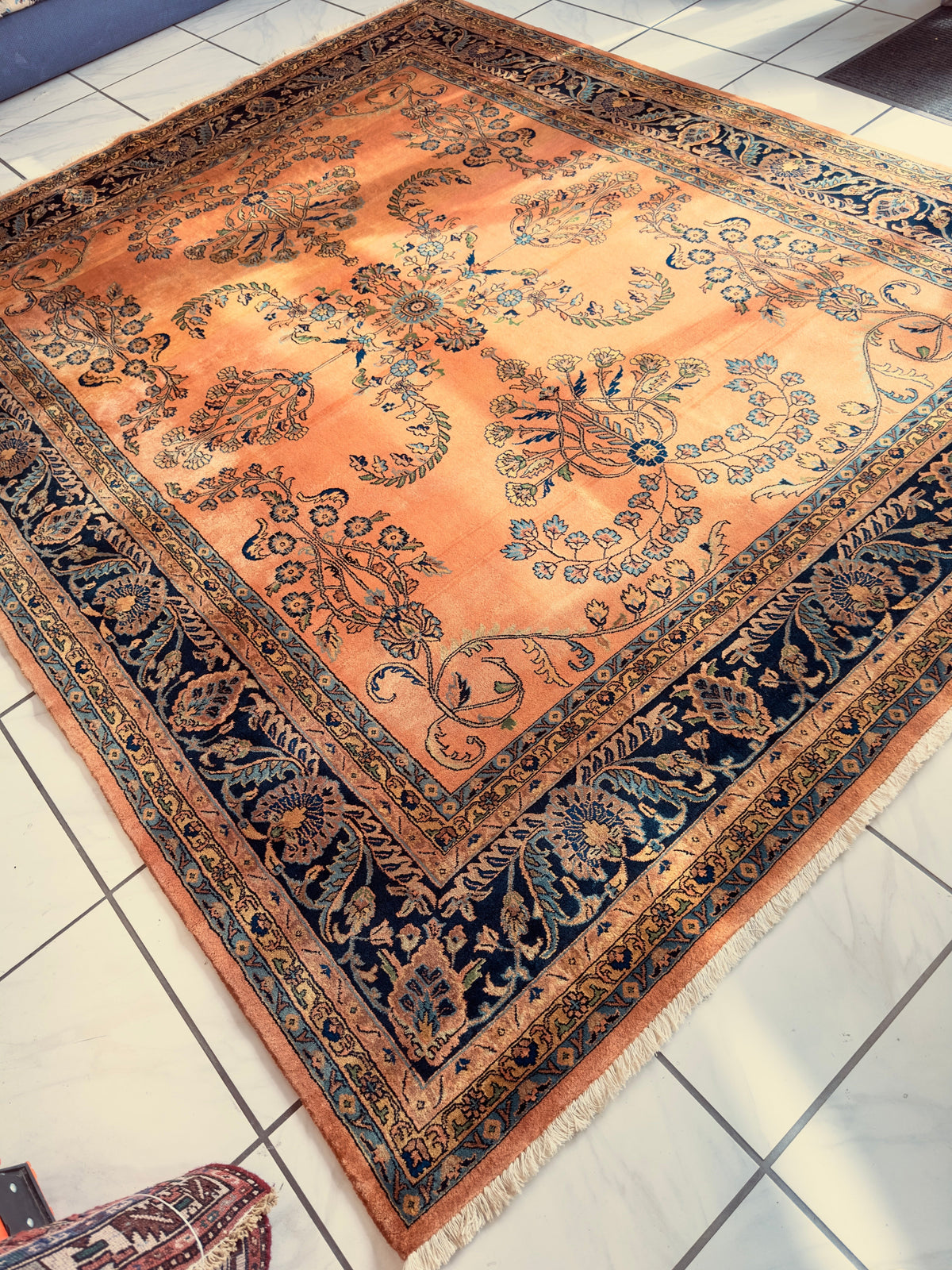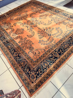 8x10, large, wool, Indo-Sarouk, floral, India, traditional, peach, navy, hand-knotted, area rug