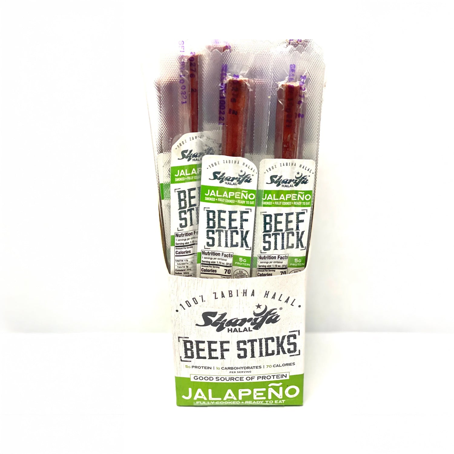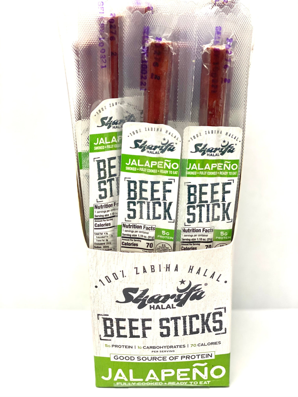 Made with 100% Halal Beef. Good Source of Protein. 5 grams of Protein, 1 gram of Carbohydrates, 70 Calories per serving. Jalapeno Smoked, Fully Cooked, Read to Eat.