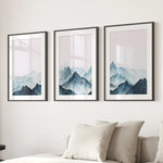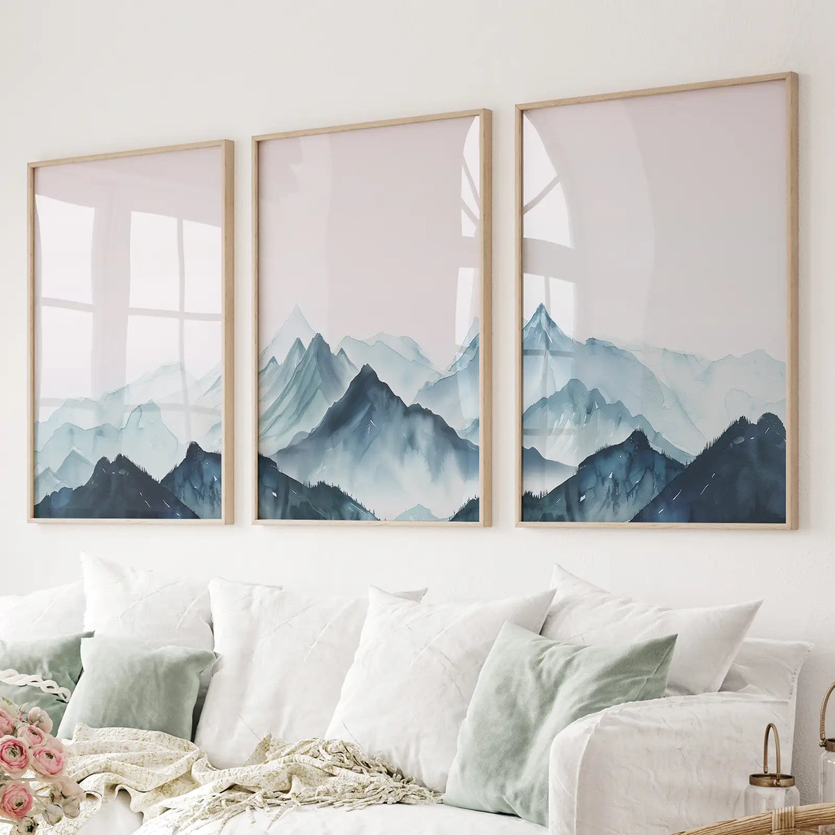 Modern mountain landscape wall art set of 3 in calming blue and gray watercolor tones. This panoramic triptych creates a serene atmosphere, making it a perfect choice for living room, bedroom, or office décor. A contemporary nature print set for stylish interiors.