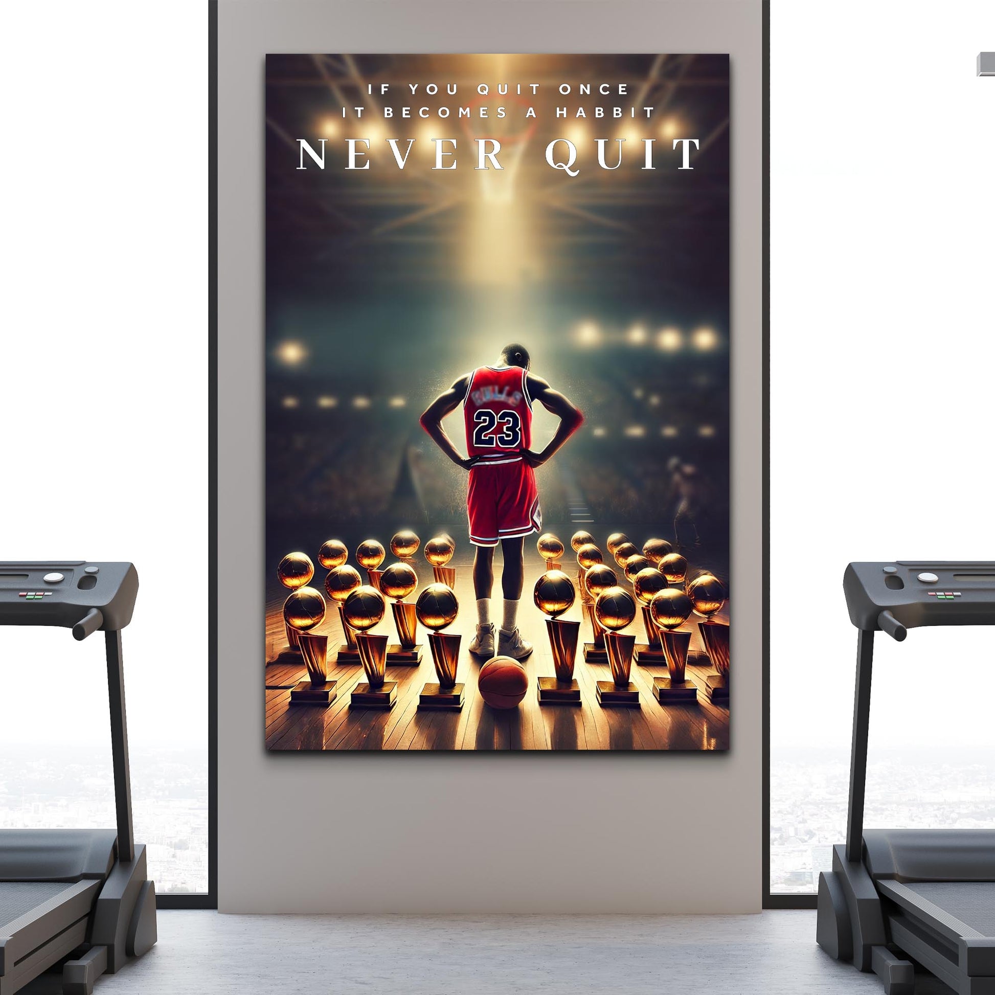 Transform your space with Never Quit - Sport Wall Art, a motivational centerpiece that embodies determination and greatness. The dynamic design, featuring an iconic sports figure surrounded by trophies under a spotlight, inspires action and resilience. Perfect for living rooms, home gyms, or offices, this artwork brings energy and focus to any environment. Let it be a daily reminder to stay driven and never give up.