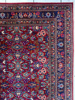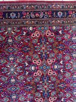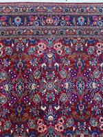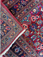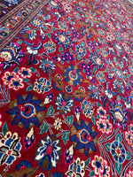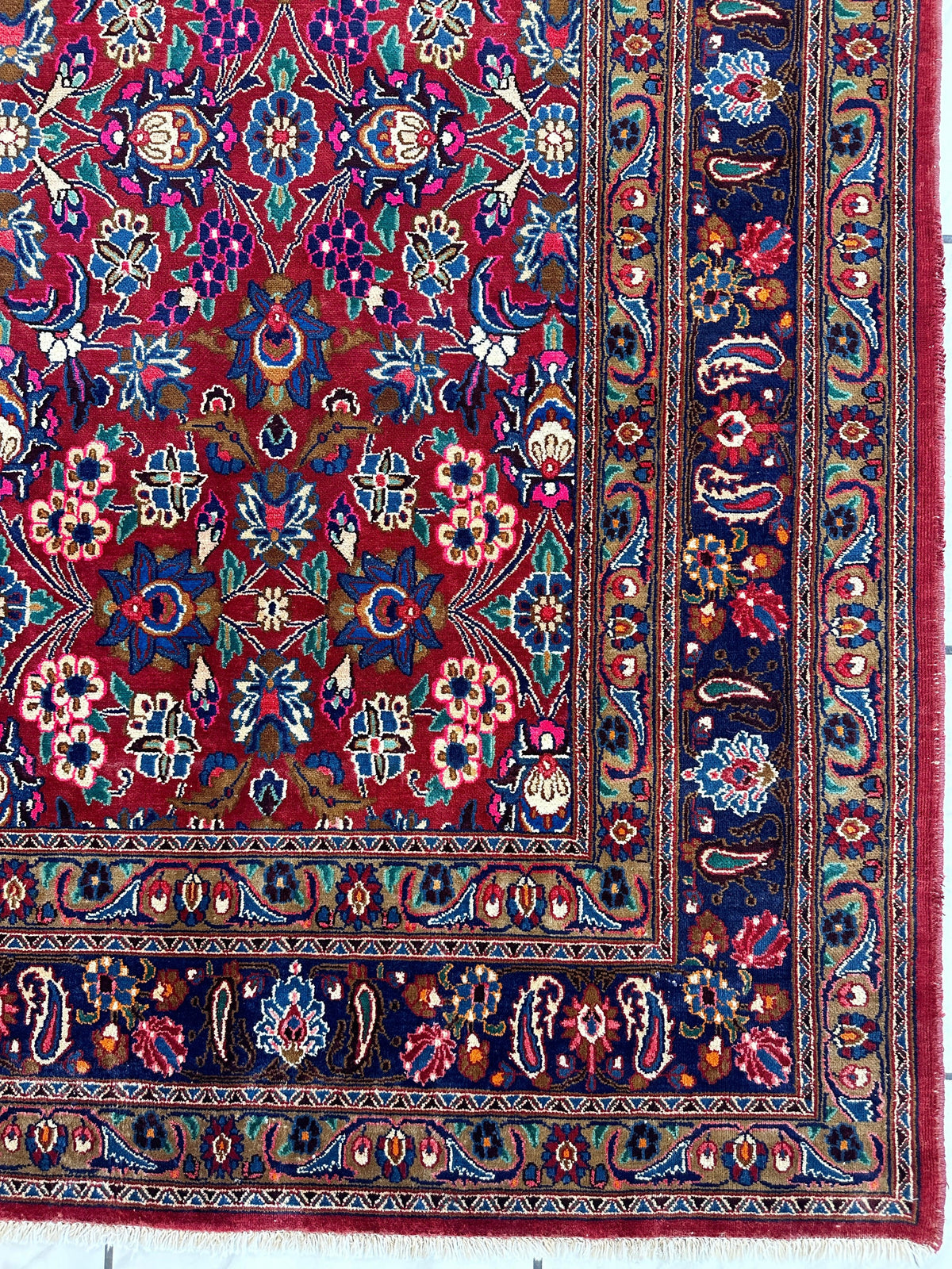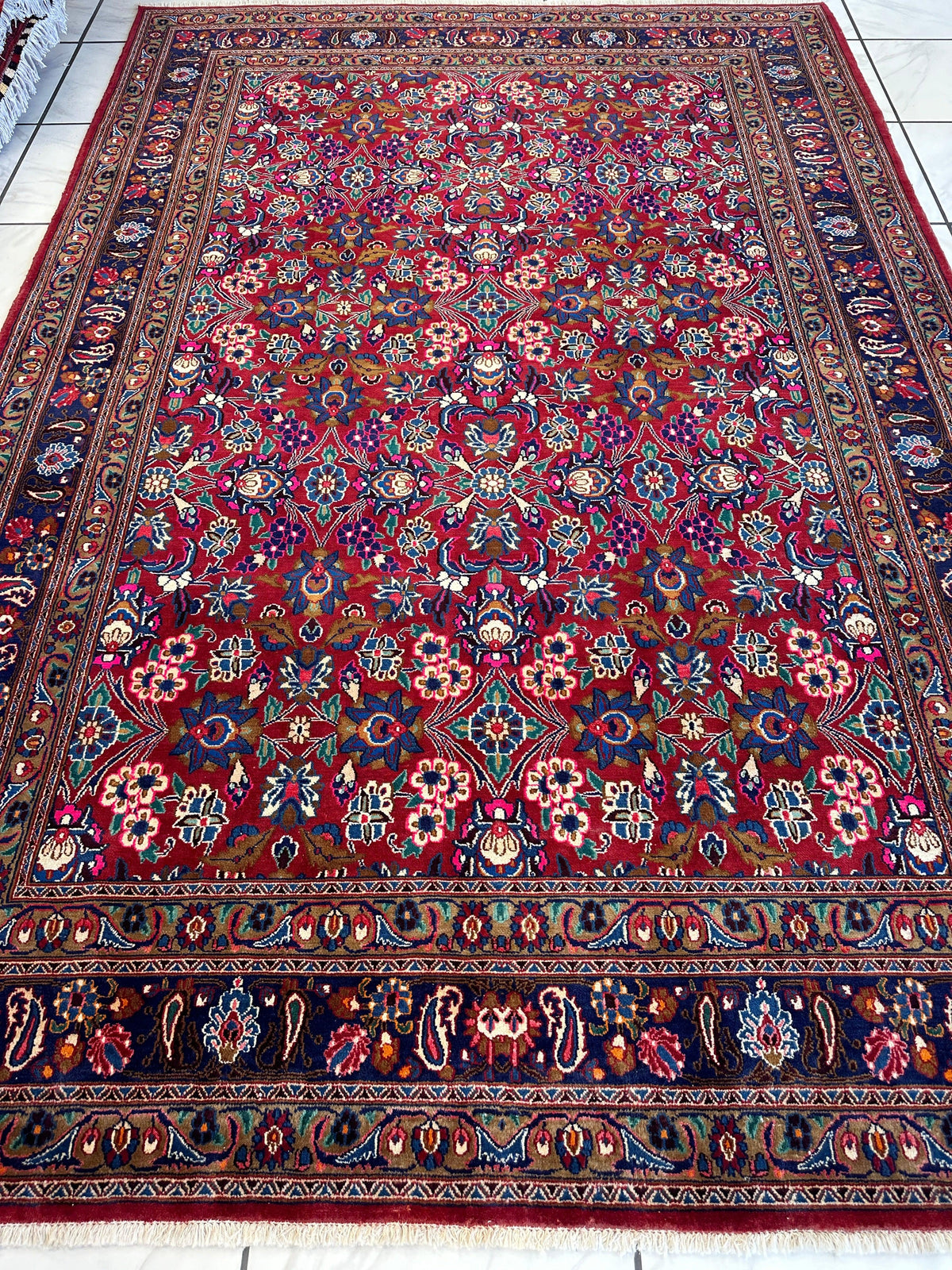This beautiful Persian Mashhad rug features intricate hand-knotted construction, making it a vintage piece of art. Made from wool with cotton warp, it showcases a stunning Mashhad design. Mashhad is one of the biggest cities of Iran and Persia. Mashhad carpets are known to be robust and enduring. A genuine Persian carpet like this one requires a lot of skill and experience. Generally, it takes several months to craft such a carpet by hand in traditional handicraft. With its size of 6'11”x10’4”, this pre-loved rug is in great condition and adds a touch of luxury to any space. Hand-made in Iran, it exudes passion and craftsmanship.