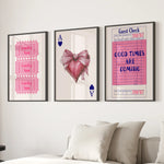 Playful and stylish wall art set of three prints featuring pink “Lucky You” tickets, a romantic red heart with ribbon in ace card style, and a vintage guest check with the quote “Good Times Are Coming.” A perfect mix of charm and optimism for modern interiors.