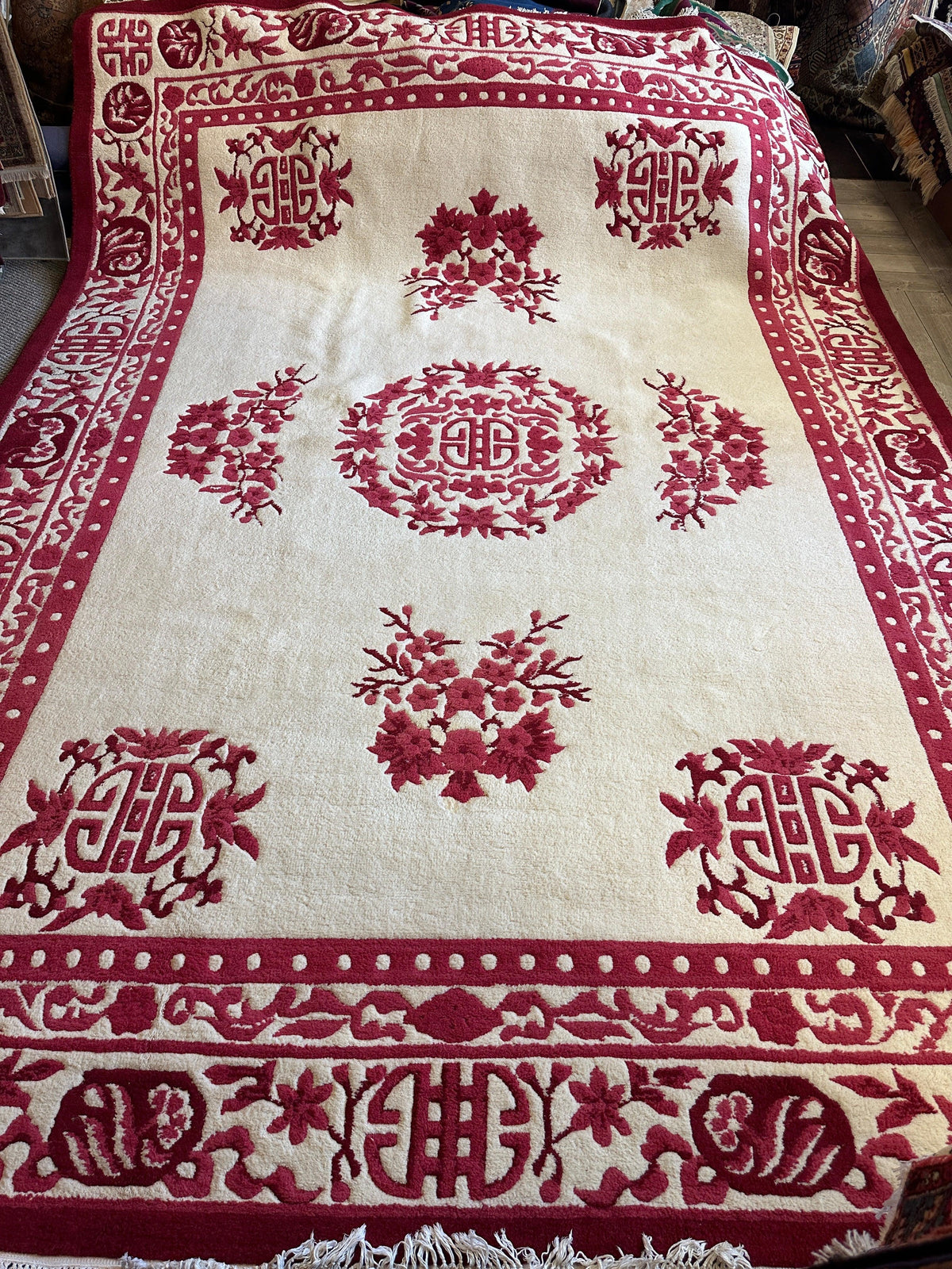 Introduce an exotic touch to your home with this unique Red & Beige Chinese Art Deco rug. Hand-knotted using only the finest 100% wool, this rug is the perfect fusion of ancient Chinese craftsmanship and modern Art Deco style. Made in India, this beautiful 11'3" x 15'5" rug is in excellent condition and will enrich any room. Enjoy timeless beauty in your home.