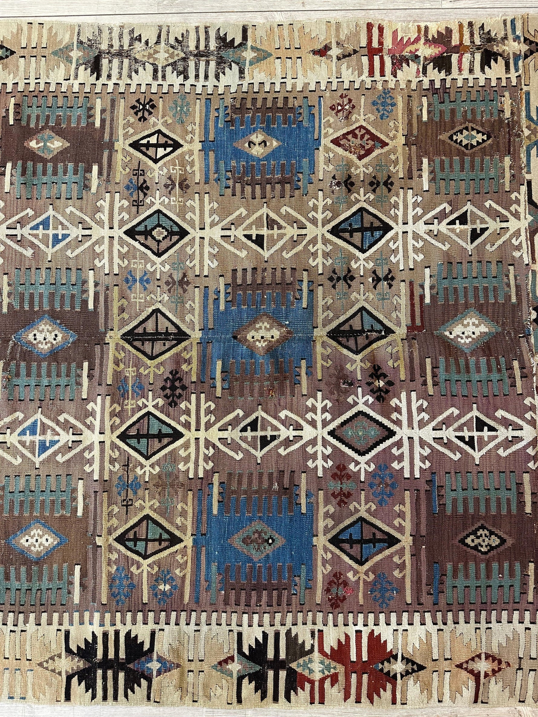 The Kilim has areas disjoining but doesn't have missing pieces. Both ends are intact (very rate for these kilims) making it highly collectible. Best wall hanging antique piece of art with glowing natural dyes.