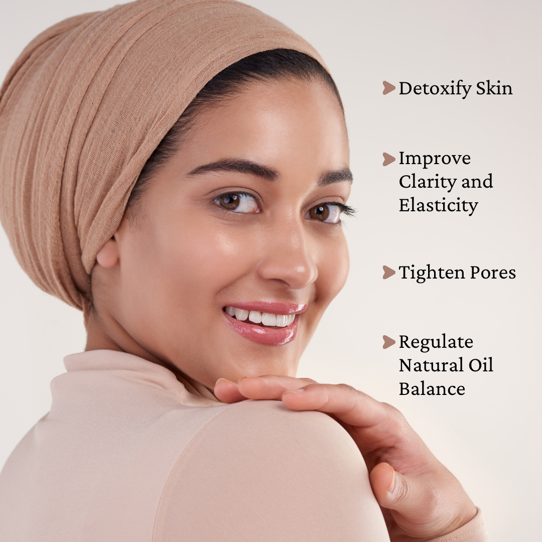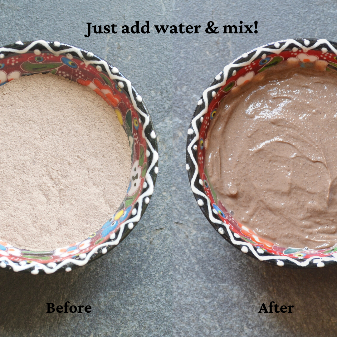 3. For very dry skin, we recommend adding 2 drops of Argan Oil. If you do, you only need to use 1 tablespoons of Rhassoul to 1.5 tablespoon of warm water. Mix the ingredients together in a bowl using a mask brush or wood spoon.