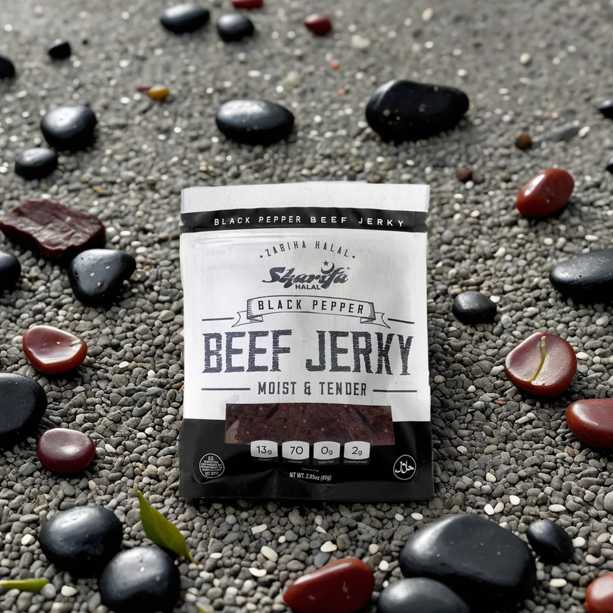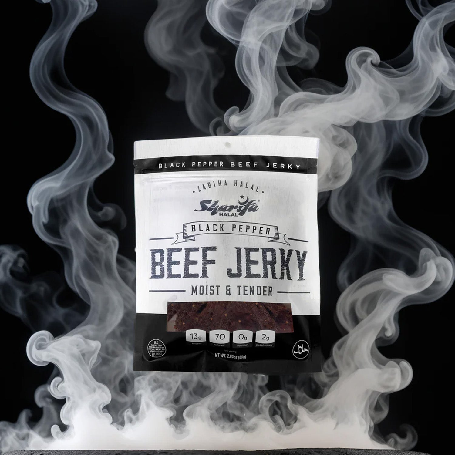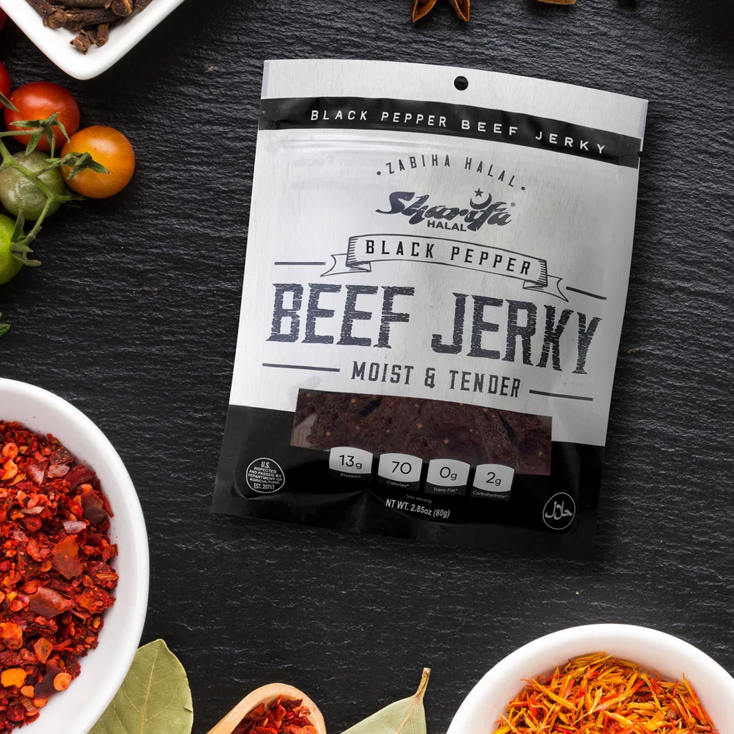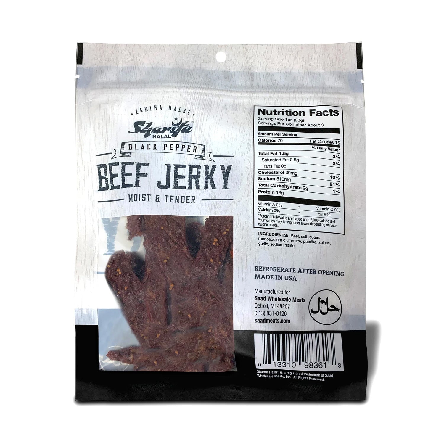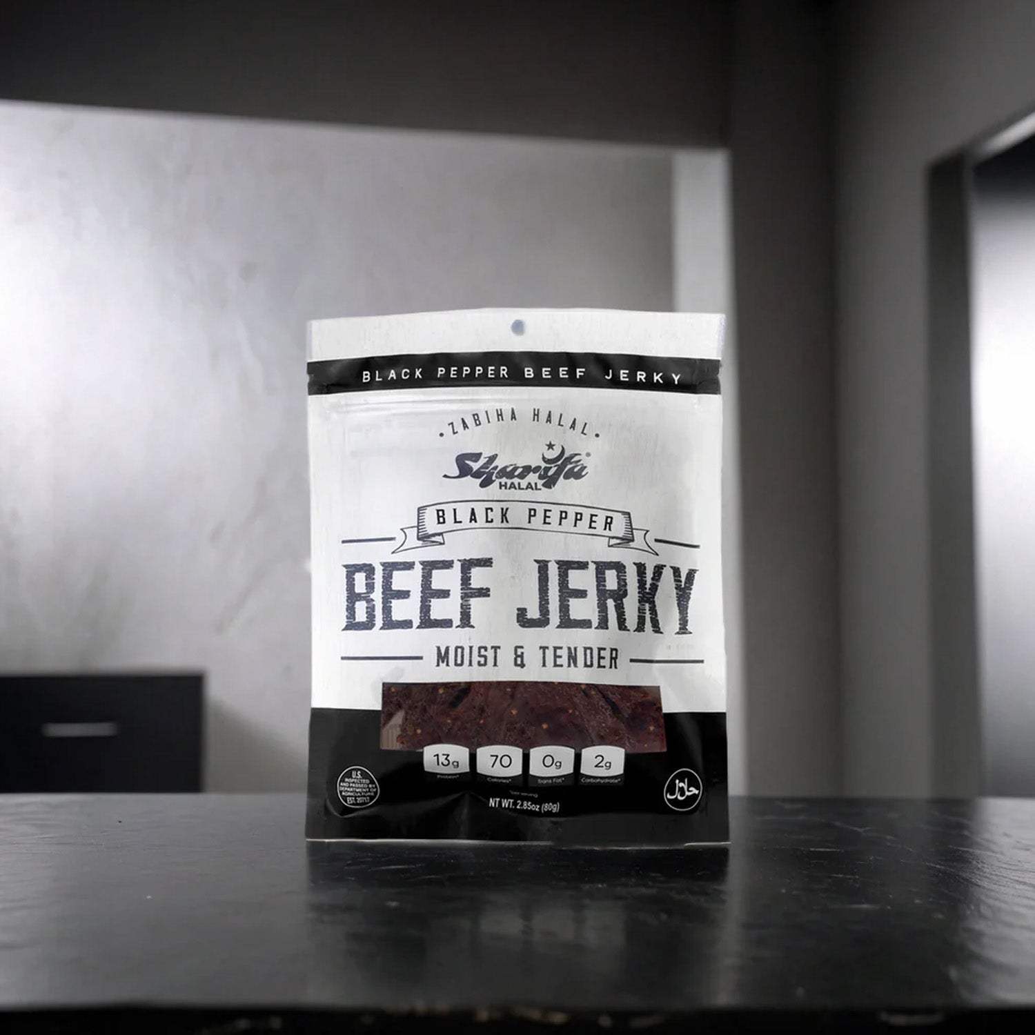 Sharifa Halal Black Pepper Beef Jerky is made with premium 100 % Zabiha Halal Beef. Many people complain about other beef jerky being too hard and too dry, while we and Sharifa Halal have produced and halal jerky product that is always moist & tender. The Sharifa Black Pepper Beef jerky makes for a great meat snack, that is much better for you than chips and dip. Our tasty product is at high 13g of Protein, only 70 calories, 0g of Trans Fat, and only 2g of Carbohydrates per serving. We also added a resealable bag so you can lock in that freshness and have it taste just like when you first opened it. Our premium halal beef has been inspected by the USDA and is at the net weight of 2.85 oz. The great thing about beef jerky is that it has a very long shelf life.