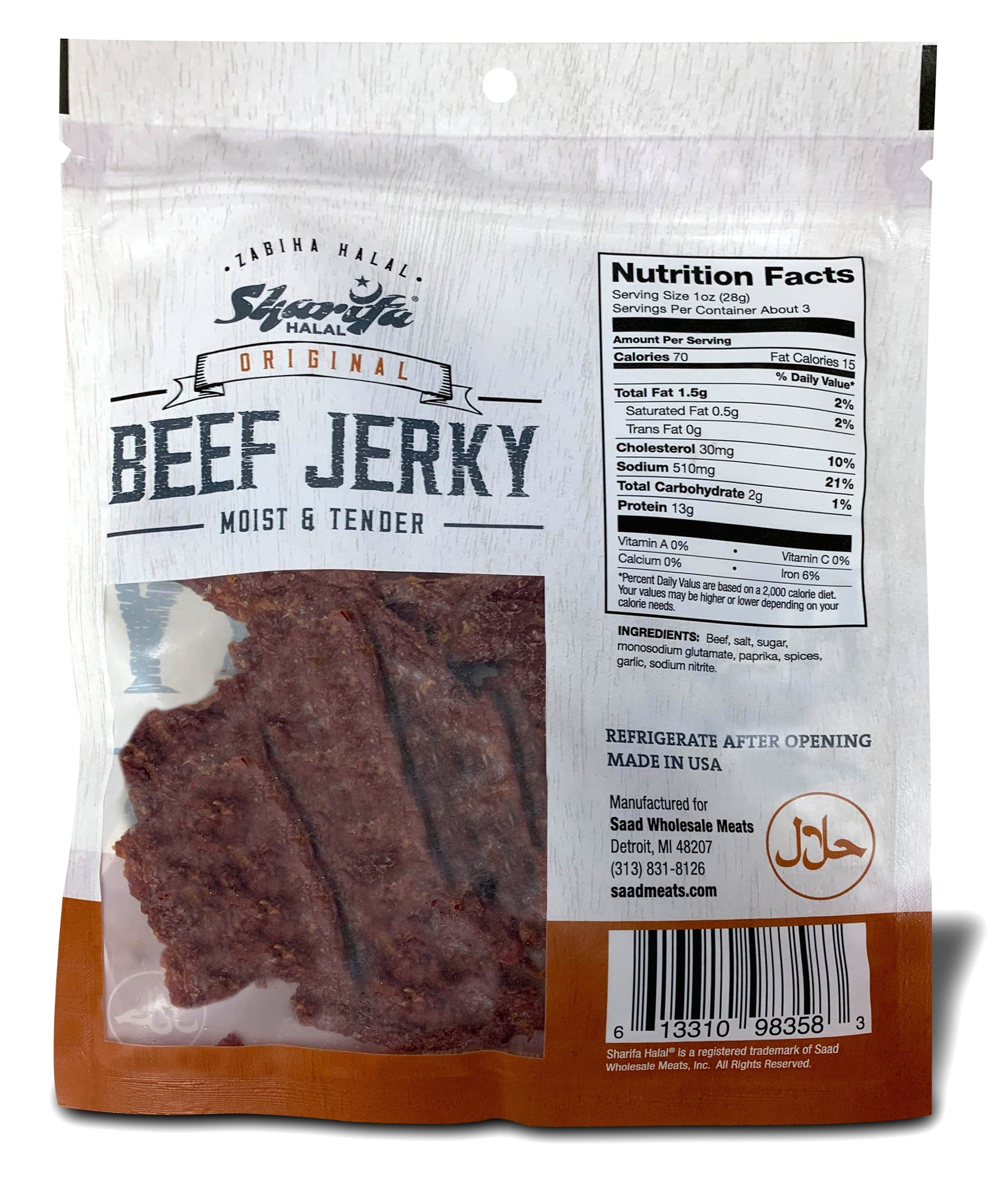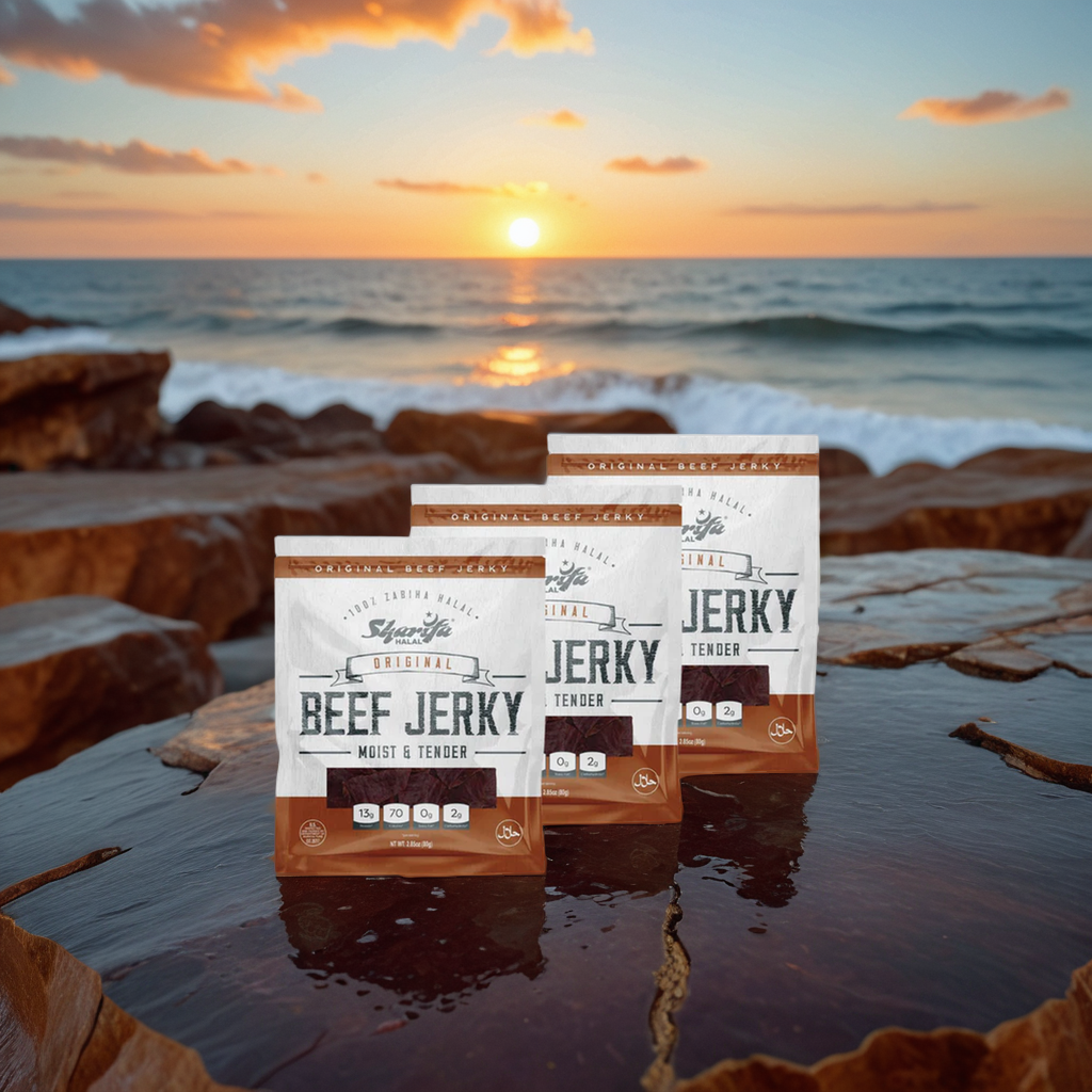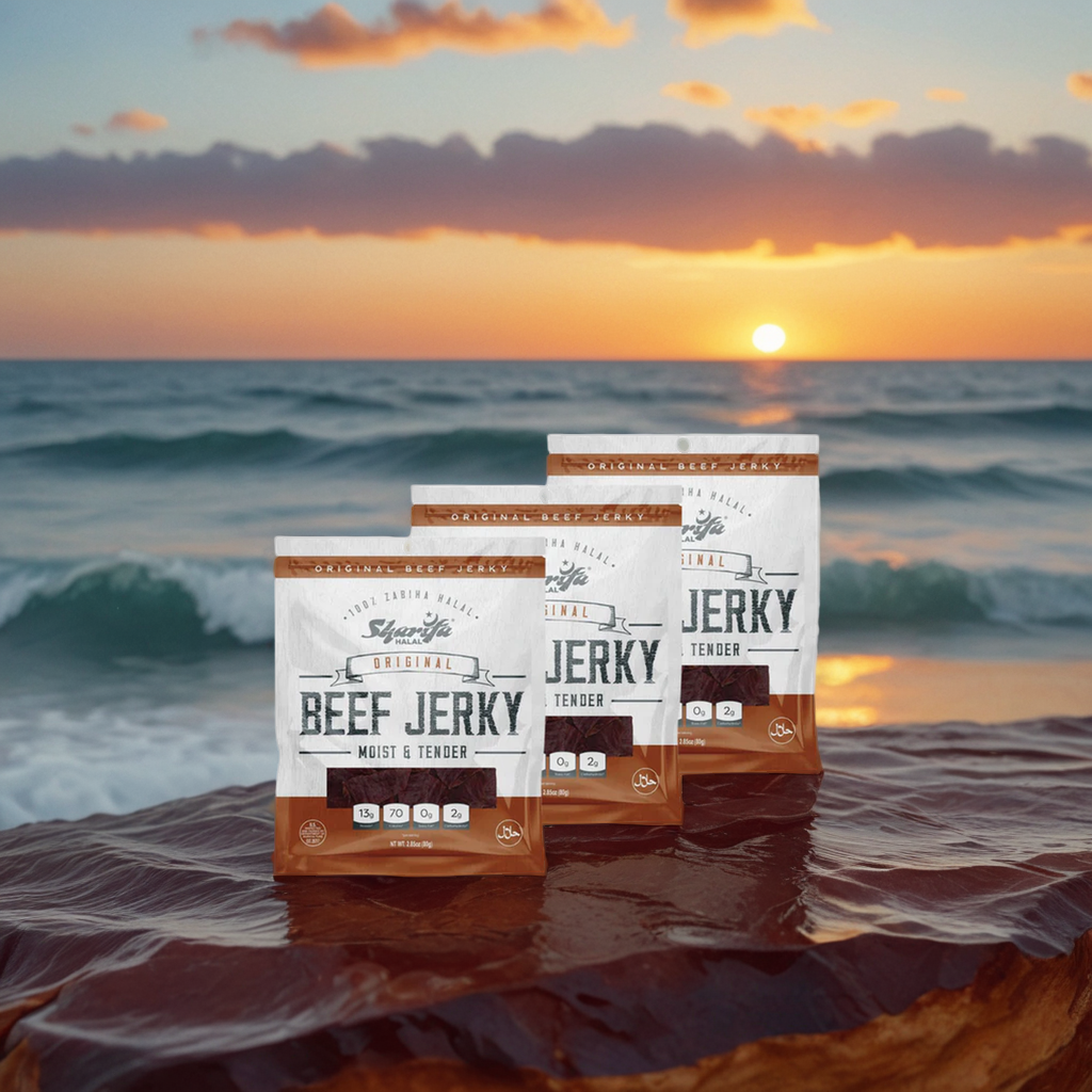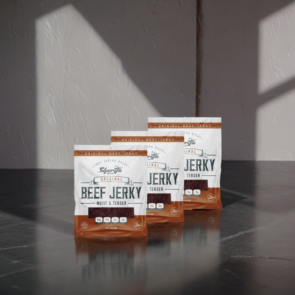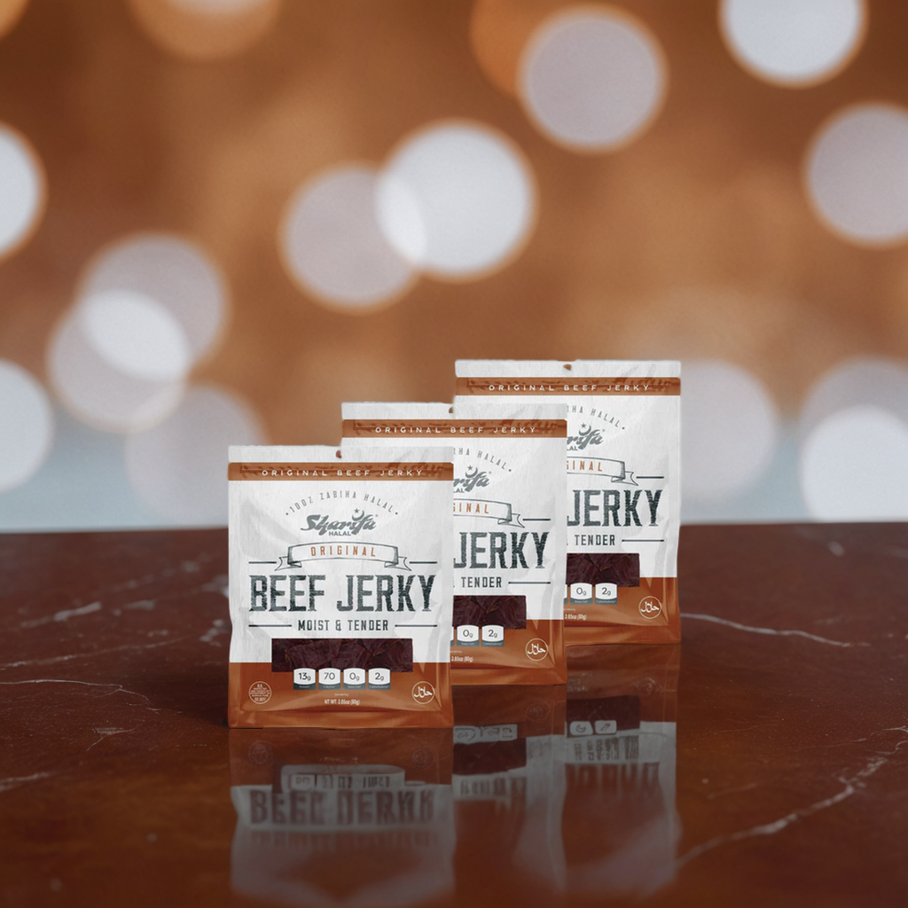 Sharifa Halal Original Beef Jerky is made with premium 100 % Zabiha Halal Beef. Many people complain about other beef jerky being too hard and too dry, while we and Sharifa Halal have produced and halal jerky product that is always moist & tender. The Sharifa Original Beef jerky makes for a great meat snack, that is much better for you than chips and dip. Our tasty product is at high 13g of Protein, only 70 calories, 0g of Trans Fat, and only 2g of Carbohydrates per serving. We also added a resealable bag so you can lock in that freshness and have it taste just like when you first opened it. Our premium halal beef has been inspected by the USDA and is at the net weight of 2.85 oz. The great thing about beef jerky is that it has a very long shelf life.