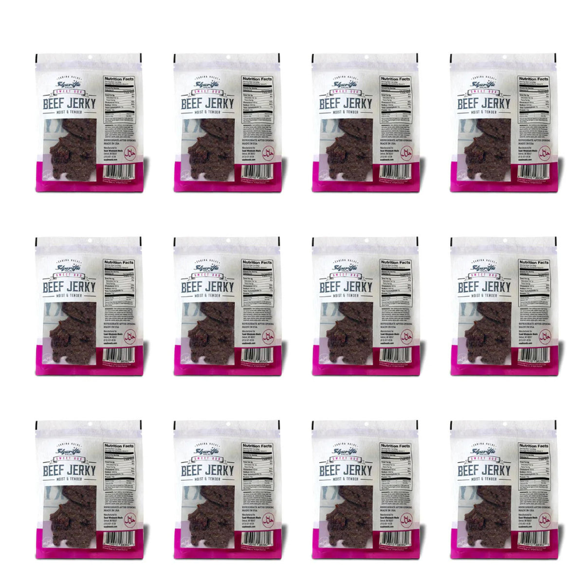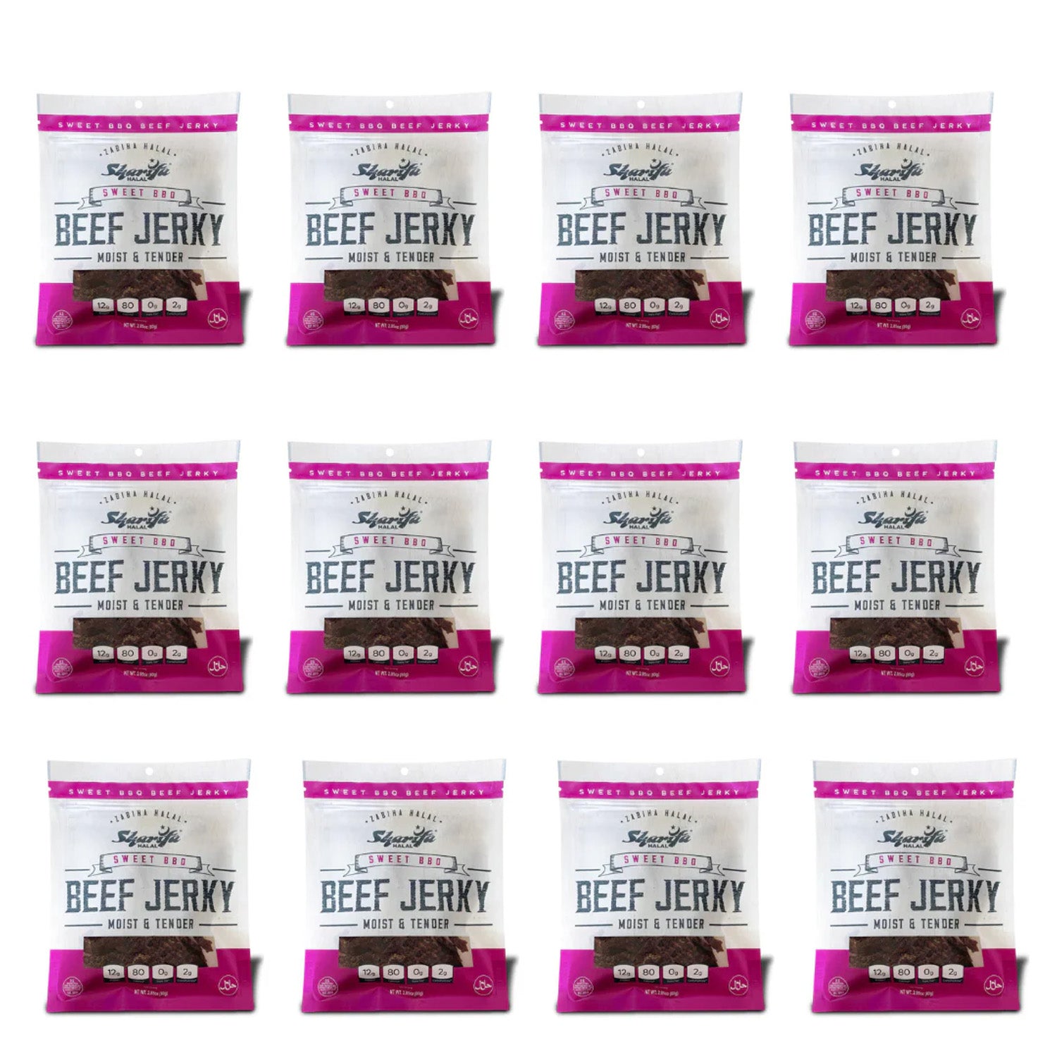 SHARIFA HALAL BEEF JERKY, SWEET BBQ, (1 CASE) (12-2.85 OZ. BAGS) – GREAT EVERYDAY HALAL JERKY BEEF MEAT SNACK, 100 % REAL ZABIHA HALAL BEEF, 12G OF PROTEIN, 80 CALORIES, 0G TRANS FAT, & 2G OF CARBOHYDRATES