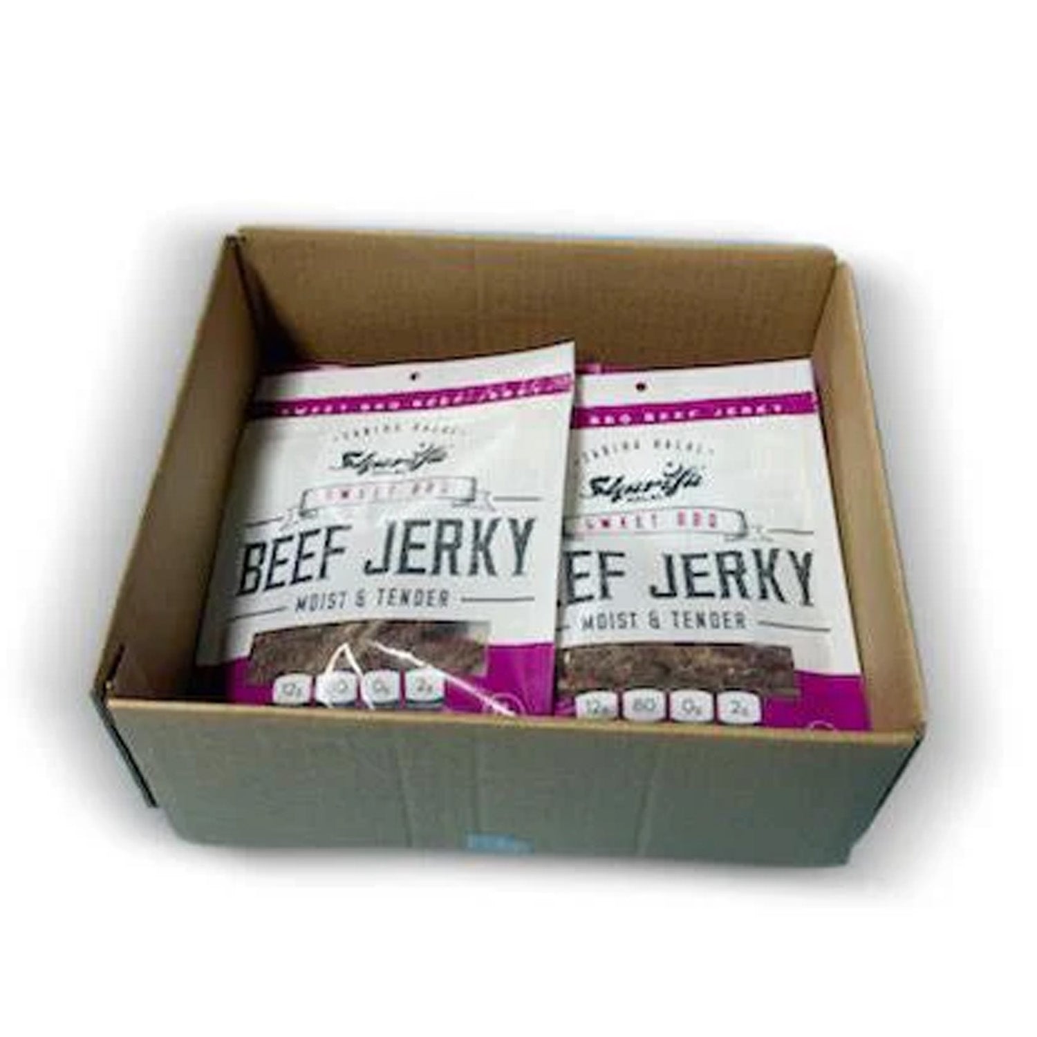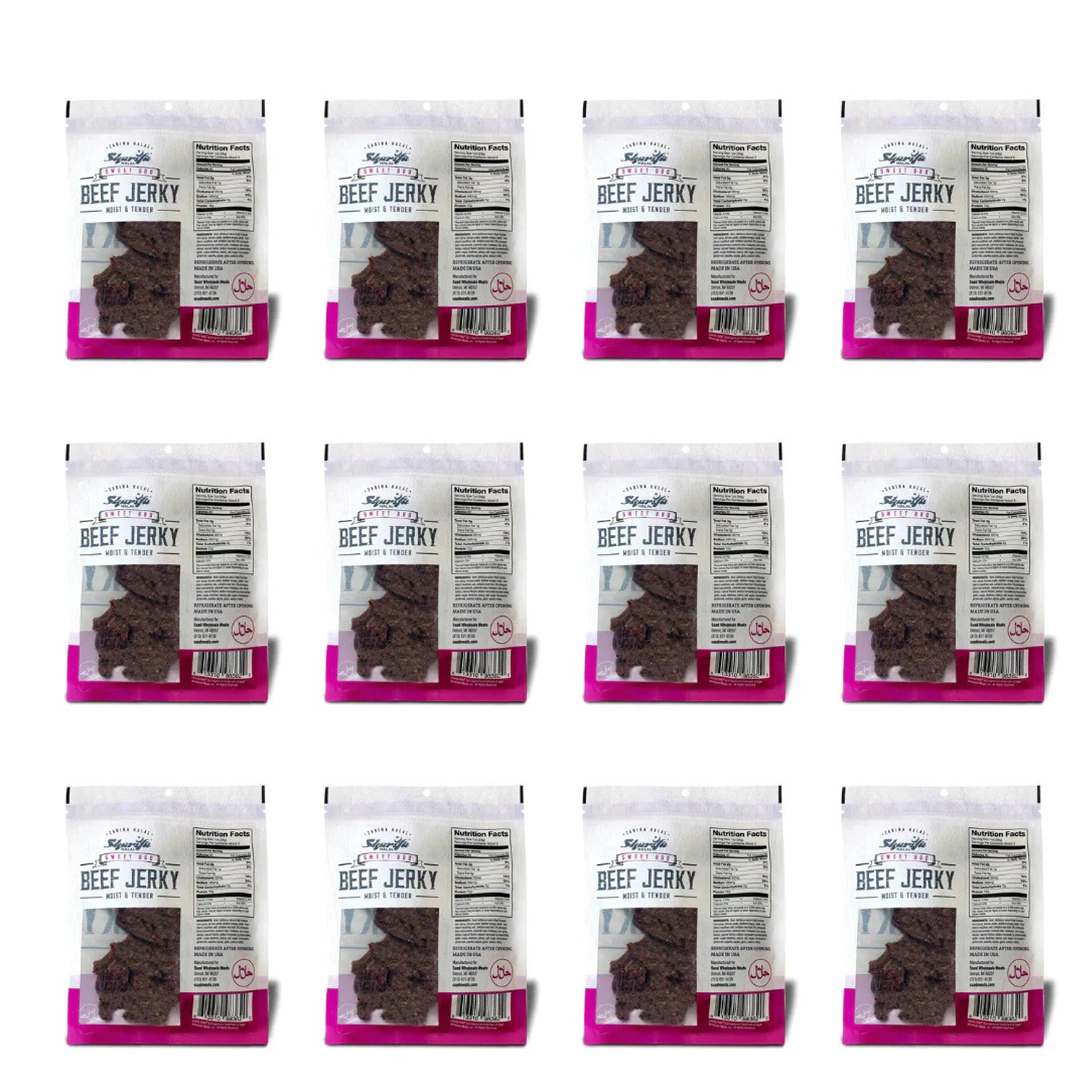 Sharifa Halal Sweet BBQ Beef Jerky is made with premium 100 % Zabiha Halal Beef. Many people complain about other beef jerky being too hard and too dry, while we and Sharifa Halal have produced and halal jerky product that is always moist & tender. The Sharifa Sweet BBQ Beef jerky makes for a great meat snack, that is much better for you than chips and dip. Our tasty product is at high 12g of Protein, only 80 calories, 0g of Trans Fat, and only 2g of Carbohydrates per serving. We also added a resealable bag so you can lock in that freshness and have it taste just like when you first opened it. Our premium halal beef has been inspected by the USDA and is at the net weight of 2.85 oz. The great thing about beef jerky is that it has a very long shelf life.