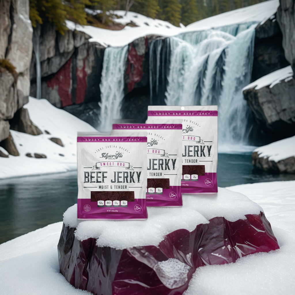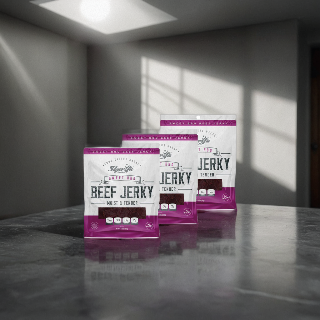 Sharifa Halal Sweet BBQ Beef Jerky is made with premium 100 % Zabiha Halal Beef. Many people complain about other beef jerky being too hard and too dry, while we and Sharifa Halal have produced and halal jerky product that is always moist & tender. The Sharifa Sweet BBQ Beef jerky makes for a great meat snack, that is much better for you than chips and dip. Our tasty product is at high 12g of Protein, only 80 calories, 0g of Trans Fat, and only 2g of Carbohydrates per serving. We also added a resealable bag so you can lock in that freshness and have it taste just like when you first opened it. Our premium halal beef has been inspected by the USDA and is at the net weight of 2.85 oz. The great thing about beef jerky is that it has a very long shelf life.