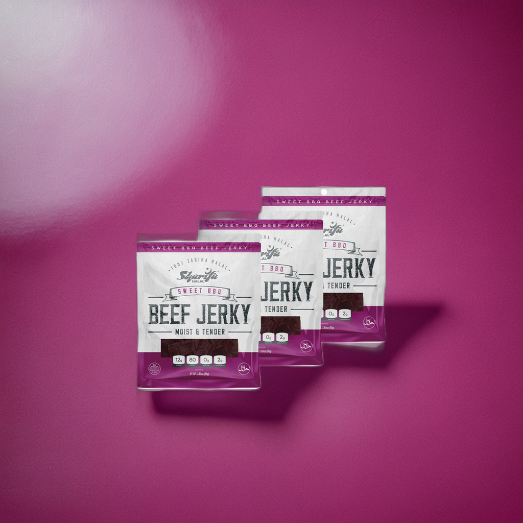 Sharifa Halal Beef Jerky, Sweet BBQ, (3) 2.85 oz. Bag – Great Everyday Halal Jerky Beef Meat Snack, 100 % Real Zabiha Halal Beef, 12g of Protein, 80 Calories, 0g Trans Fat, & 2g of Carbohydrates