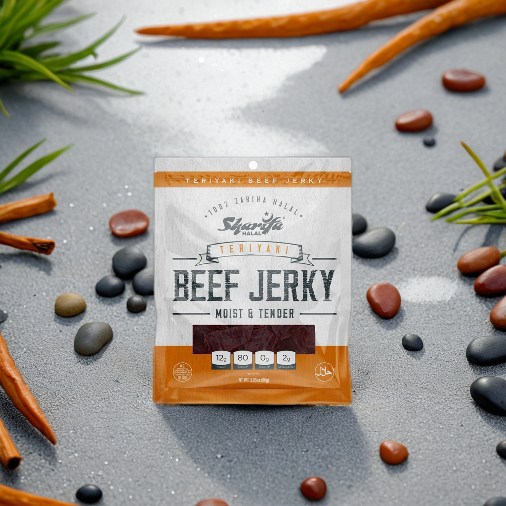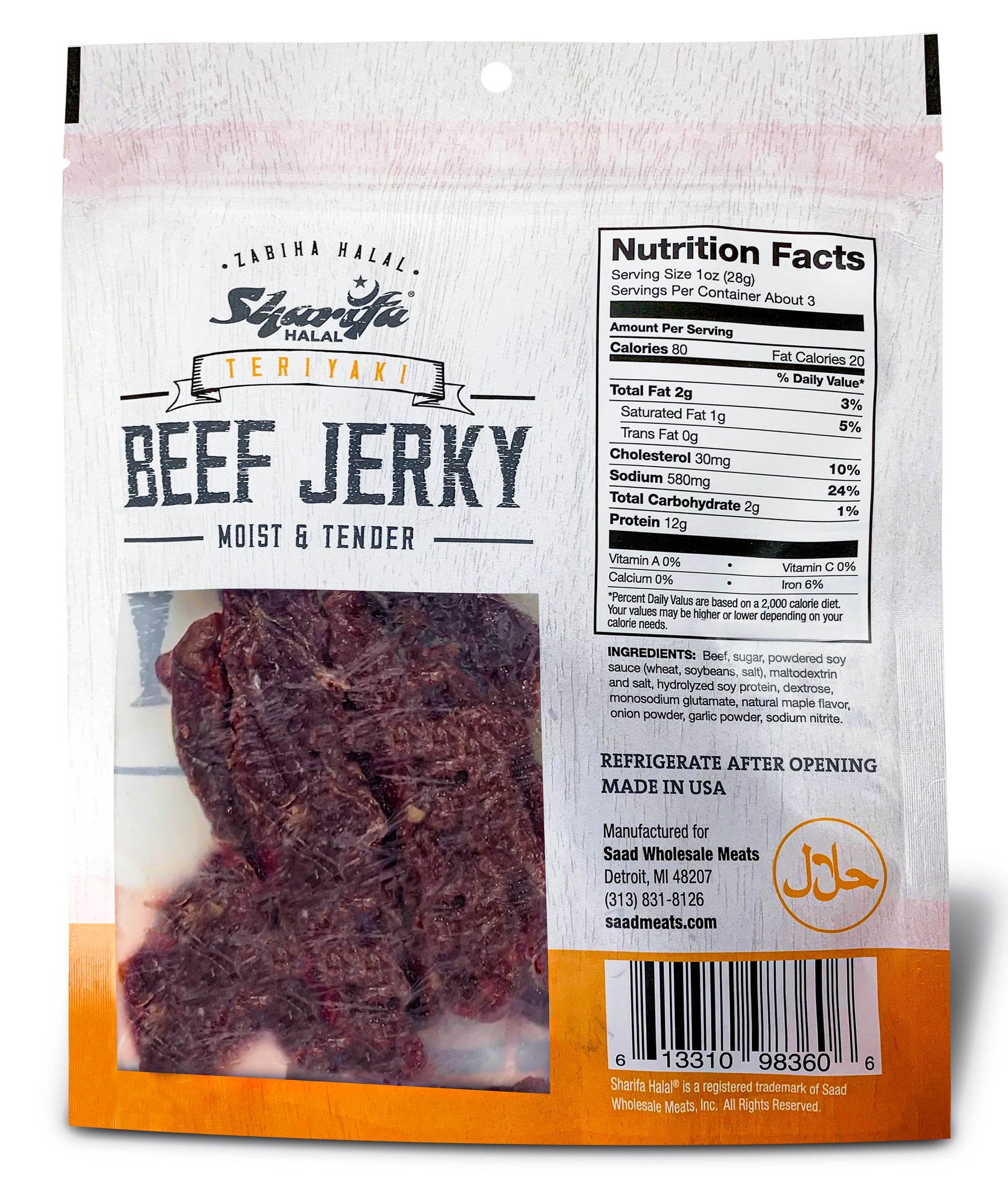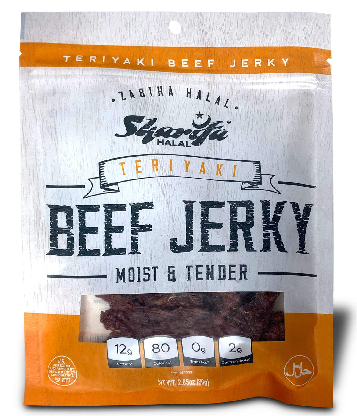 Sharifa Halal Teriyaki Beef Jerky is made with premium 100 % Zabiha Halal Beef. Many people complain about other beef jerky being too hard and too dry, while we and Sharifa Halal have produced and halal jerky product that is always moist & tender. The Sharifa Teriyaki Beef jerky makes for a great meat snack, that is much better for you than chips and dip. Our tasty product is at high 12g of Protein, only 80 calories, 0g of Trans Fat, and only 2g of Carbohydrates per serving. We also added a resealable bag so you can lock in that freshness and have it taste just like when you first opened it. Our premium halal beef has been inspected by the USDA and is at the net weight of 2.85 oz. The great thing about beef jerky is that it has a very long shelf life.