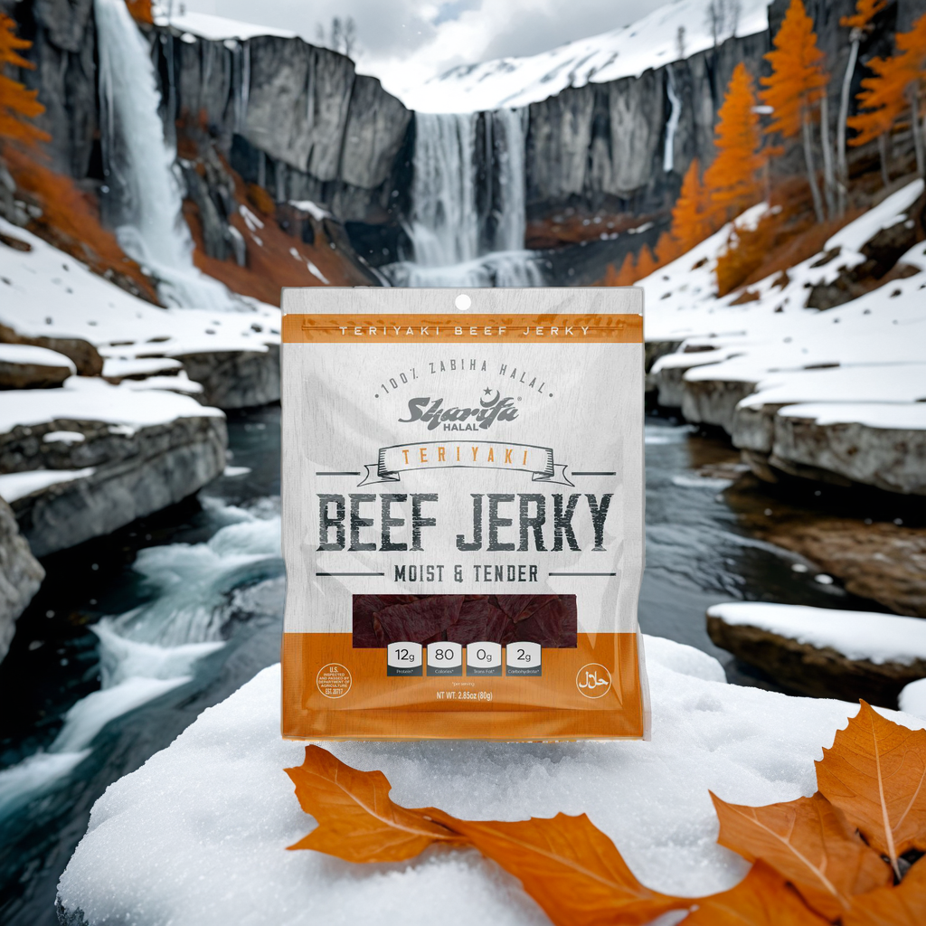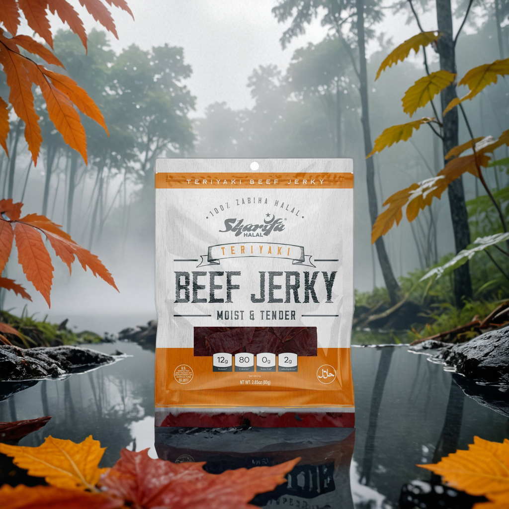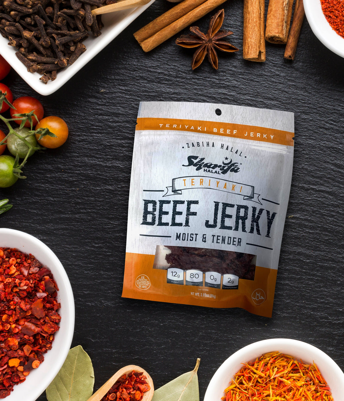 Sharifa Halal Teriyaki Beef Jerky is made with premium 100 % Zabiha Halal Beef. Many people complain about other beef jerky being too hard and too dry, while we and Sharifa Halal have produced and halal jerky product that is always moist & tender. The Sharifa Teriyaki Beef jerky makes for a great meat snack, that is much better for you than chips and dip. Our tasty product is at high 12g of Protein, only 80 calories, 0g of Trans Fat, and only 2g of Carbohydrates per serving. We also added a resealable bag so you can lock in that freshness and have it taste just like when you first opened it. Our premium halal beef has been inspected by the USDA and is at the net weight of 2.85 oz. The great thing about beef jerky is that it has a very long shelf life.