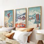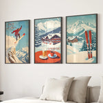 Vintage ski wall art set of 3, featuring snowboard jump, après ski coffee scene, and alpine chalet with skis. Perfect for ski lodge, cabin, or mountain home winter decor. Retro alpine wall prints for ski lovers and rustic chalet interiors.