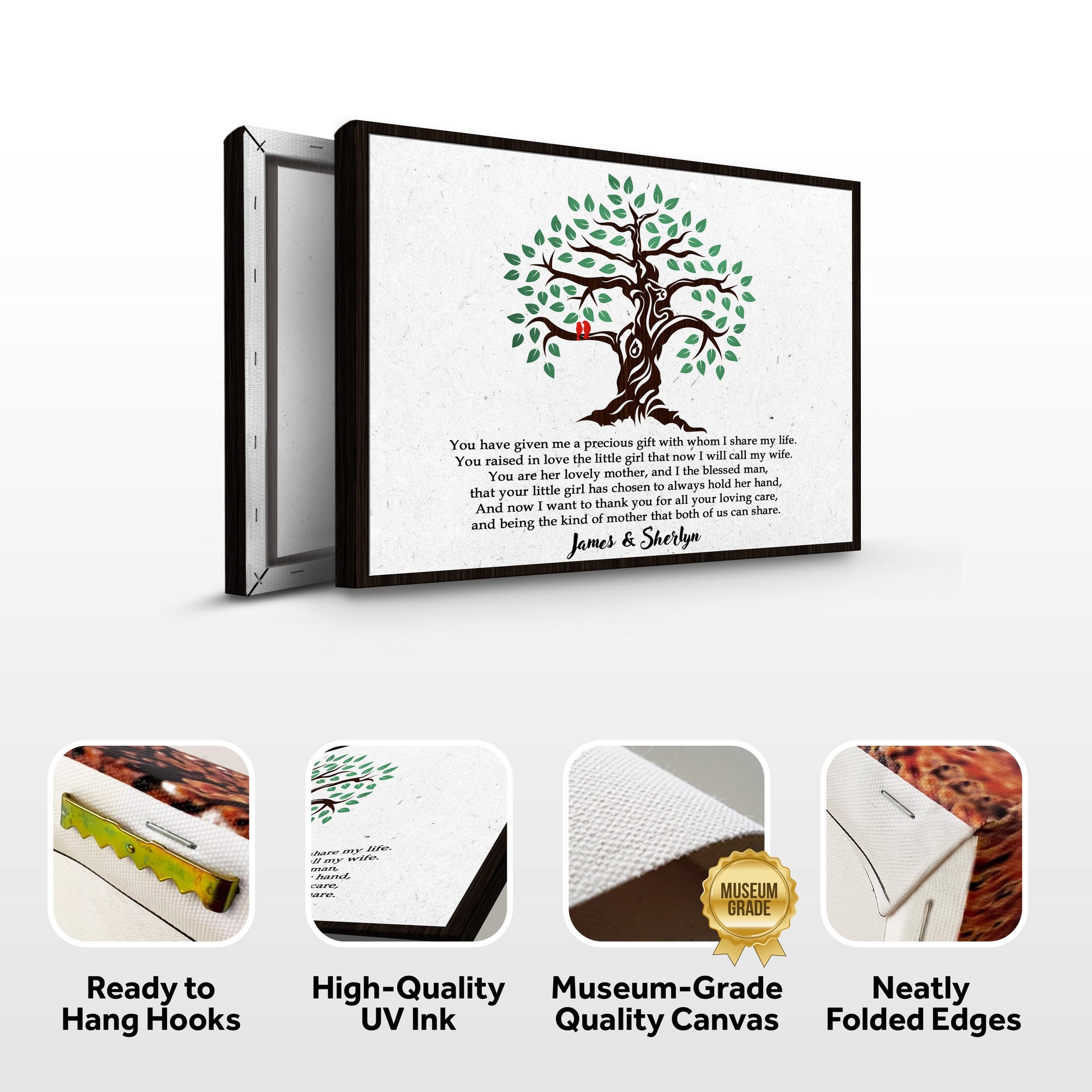 This Thank You, Mother-in-Law sign is the ideal gift option for your adoring mother-in-law to show her how much you value how she nurtured your lifetime partner to be the man he is today. Make it more special by adding your and your spouse's name on the Thank You, Mother-in-Law canvas print.