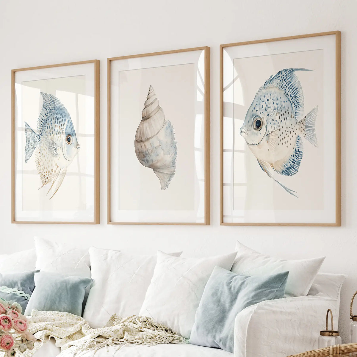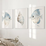 Trendy Nautical Wall Art Set of 3. Seashell and Fishes Posters