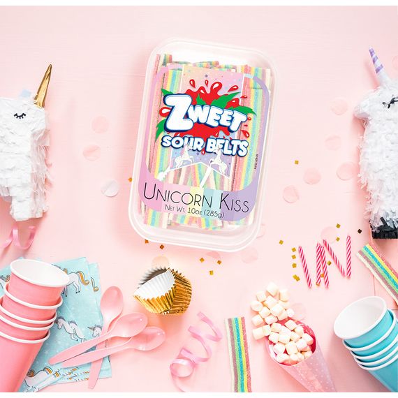 Zweet Unicorn Kiss Licorice trays are packed with fruity flavor and a sweet and sour punch. These chewy belts are a fun treat for everyone!