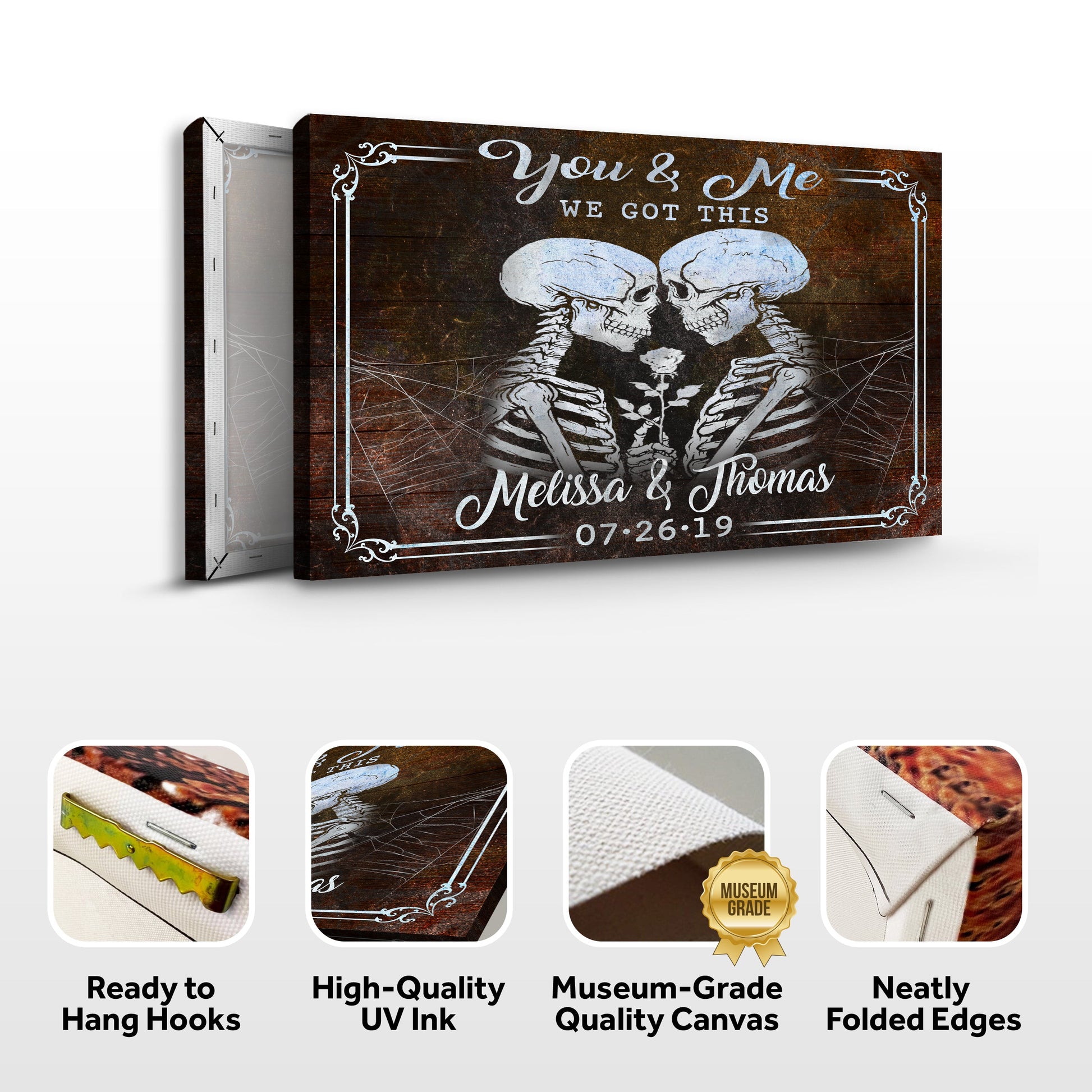 Do you and your significant other like romance and gothic culture? You'll like our We Got This Skeleton Couple sign if that's the case. You may personalize it with a quotation you and your partner adore or the day you two first met. It features a skeleton couple in love. It may be given as a Valentine's Day gift or hung in the bedroom above the bed. Regardless, our We Got This Skeleton Couple canvas print is undoubtedly a special approach to conveying your emo personality and affection for your significant other. Create your own today; we know you'll love it!