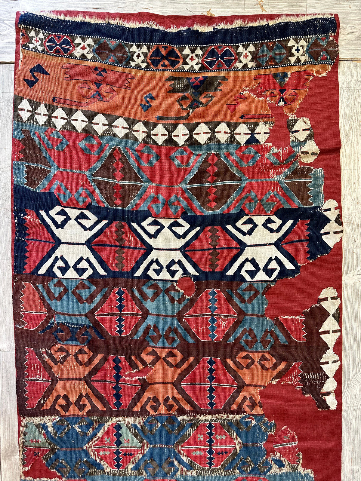Anadolu köy dokumacılığının nadir ve canlı bir örneği olan bu 19. yüzyıl el dokuması kilim parçası, birbirine geçen altıgenler ve kancalı madalyonlardan oluşan geleneksel bir kabile deseninde cesur geometrik motifler sergiliyor. Kök boya, çivit mavisi, fildişi ve toprak kahverengilerinden oluşan renk paleti, Orta Anadolu göçebe dokumacılarının doğal boyalarını ve etkileyici sanatını yansıtıyor.