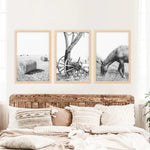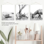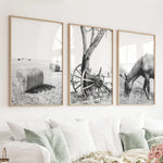 Bu 3'lü siyah beyaz rustik baskı seti, kır evinizin veya çiftlik evinizin dekoruna harika bir katkı sağlayacak. Saman yığınlarının ve eski ahşap tekerleklerin yanında bir atın yer aldığı bir sahne, benzersiz bir atmosfer yaratacaktır. Bunları ayrı ayrı asmak yerine birlikte asmanızı öneririz.
