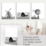 3'lü Siyah Beyaz Çiftlik Tarzı Baskı Seti. Yel Değirmeni, Ahır, Kanat