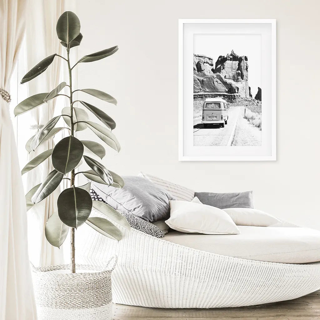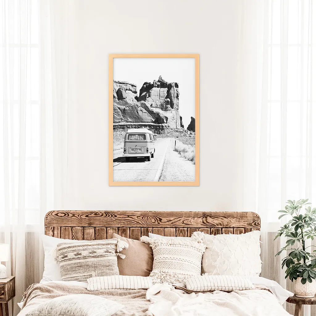 Bu büyüleyici Utah çöl manzarasının keyfini her gün çıkarmak için bu siyah beyaz posteri evinize asın. Bu retro karavan fotoğrafı, iç mekanınıza harika bir katkı sağlayacak.
